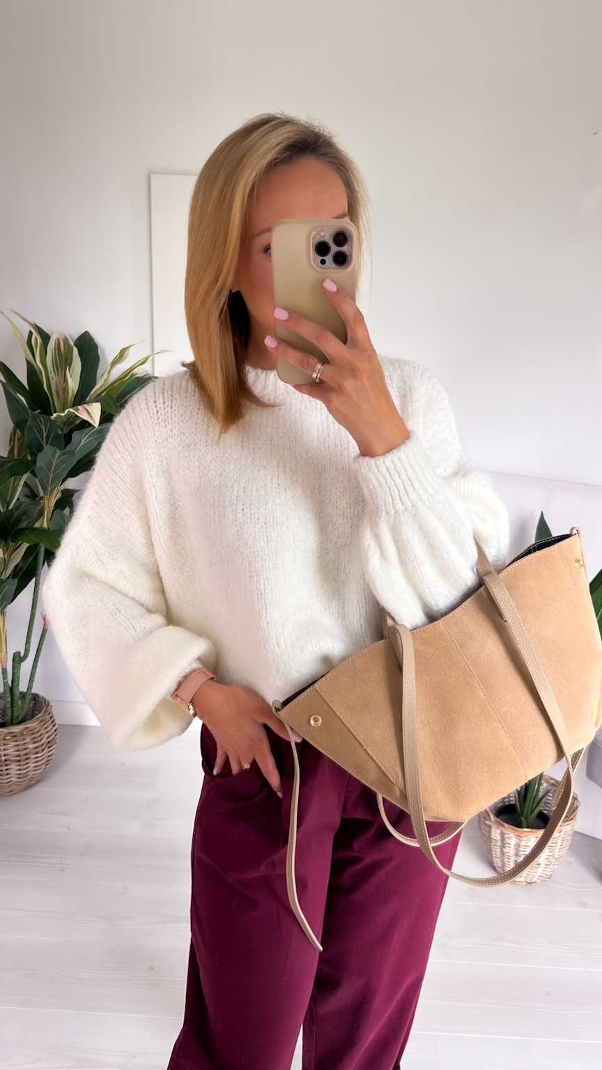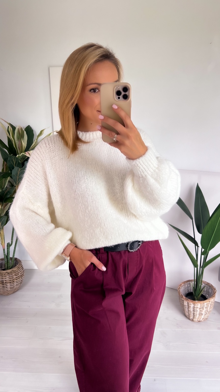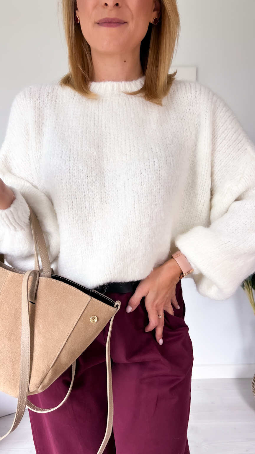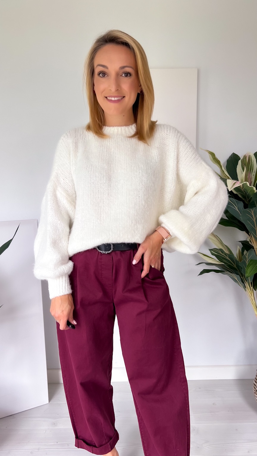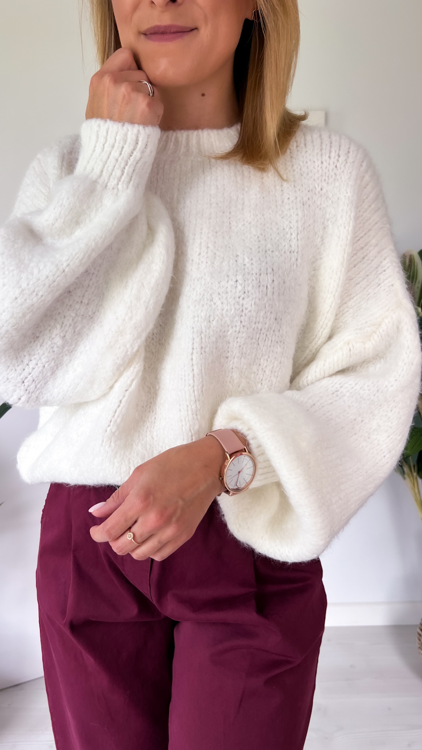 Ten niezwykle efektowny model to połączenie wygody i stylu, które przyciąga uwagę od pierwszego wejrzenia. Wykonany z mięsistej, przyjemnej w dotyku dzianiny, zapewnia komfort noszenia i doskonale otula w chłodniejsze dni. Szerokie rękawy zakończone elastycznym ściągaczem nadają całości modnego, nowoczesnego charakteru, a jednocześnie podkreślają lekkość fasonu.