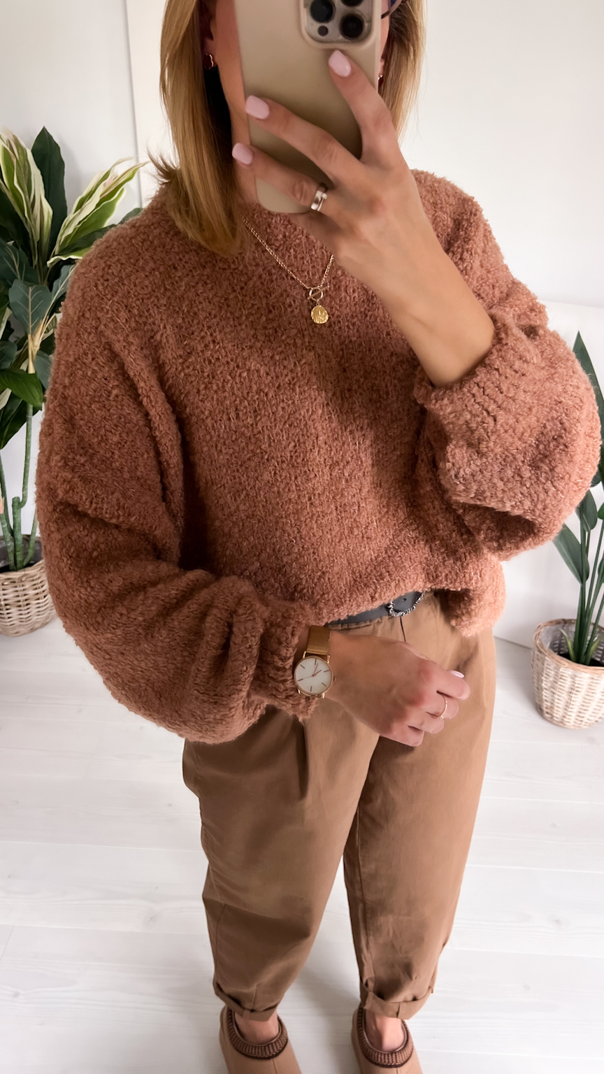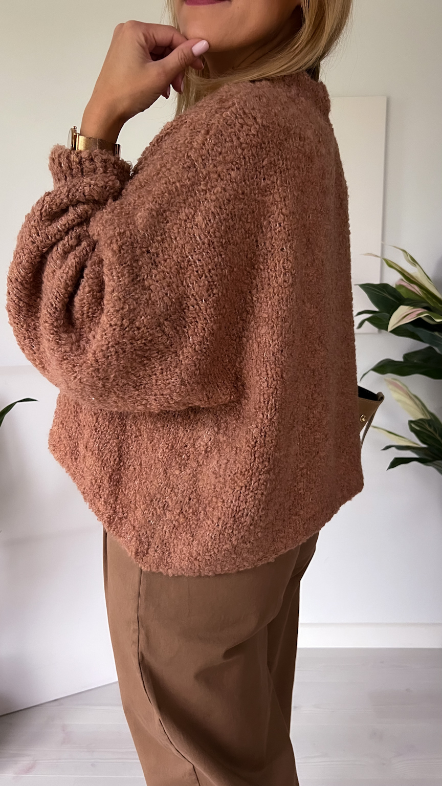 Wyjątkowy sweter wykonany z miękkiej, przyjemnej w dotyku bukli. Jego puszysta faktura sprawia, że jest niezwykle komfortowy i otula ciepłem w chłodniejsze dni. To model, który doskonale dopełni jesienne stylizacje, dodając im przytulnego i modnego charakteru.