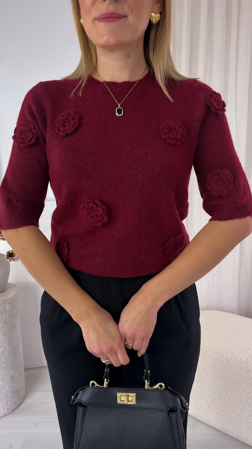 Stylowy sweterek z krótkim rękawem to połączenie klasyki z subtelną kobiecością. Model zdobią efektowne, trójwymiarowe kwiaty 3D, które dodają mu wyjątkowego charakteru i czynią go idealnym wyborem na eleganckie, ale wciąż wygodne stylizacje.