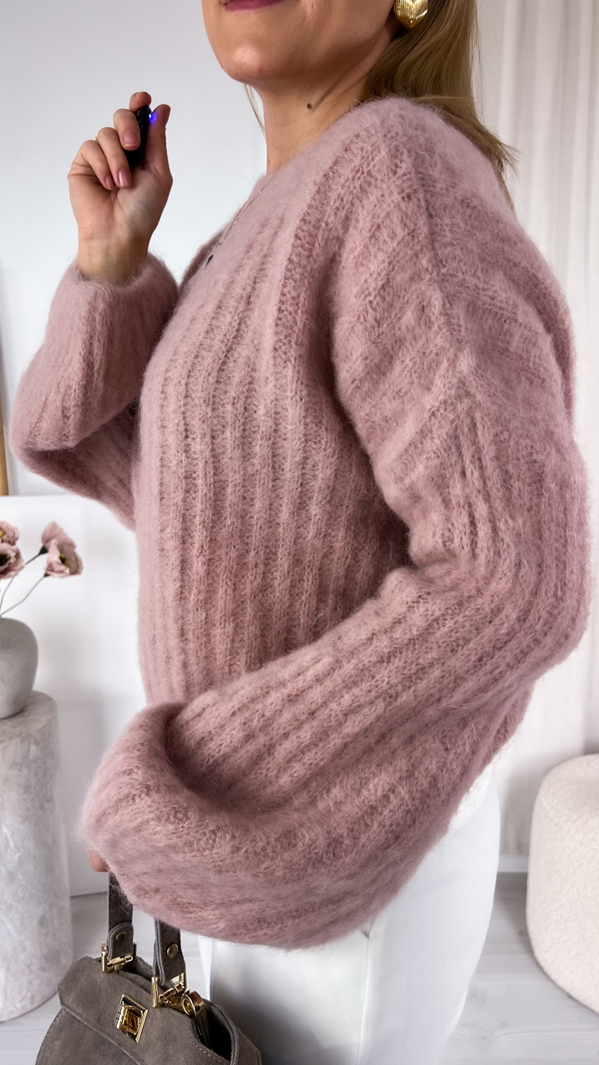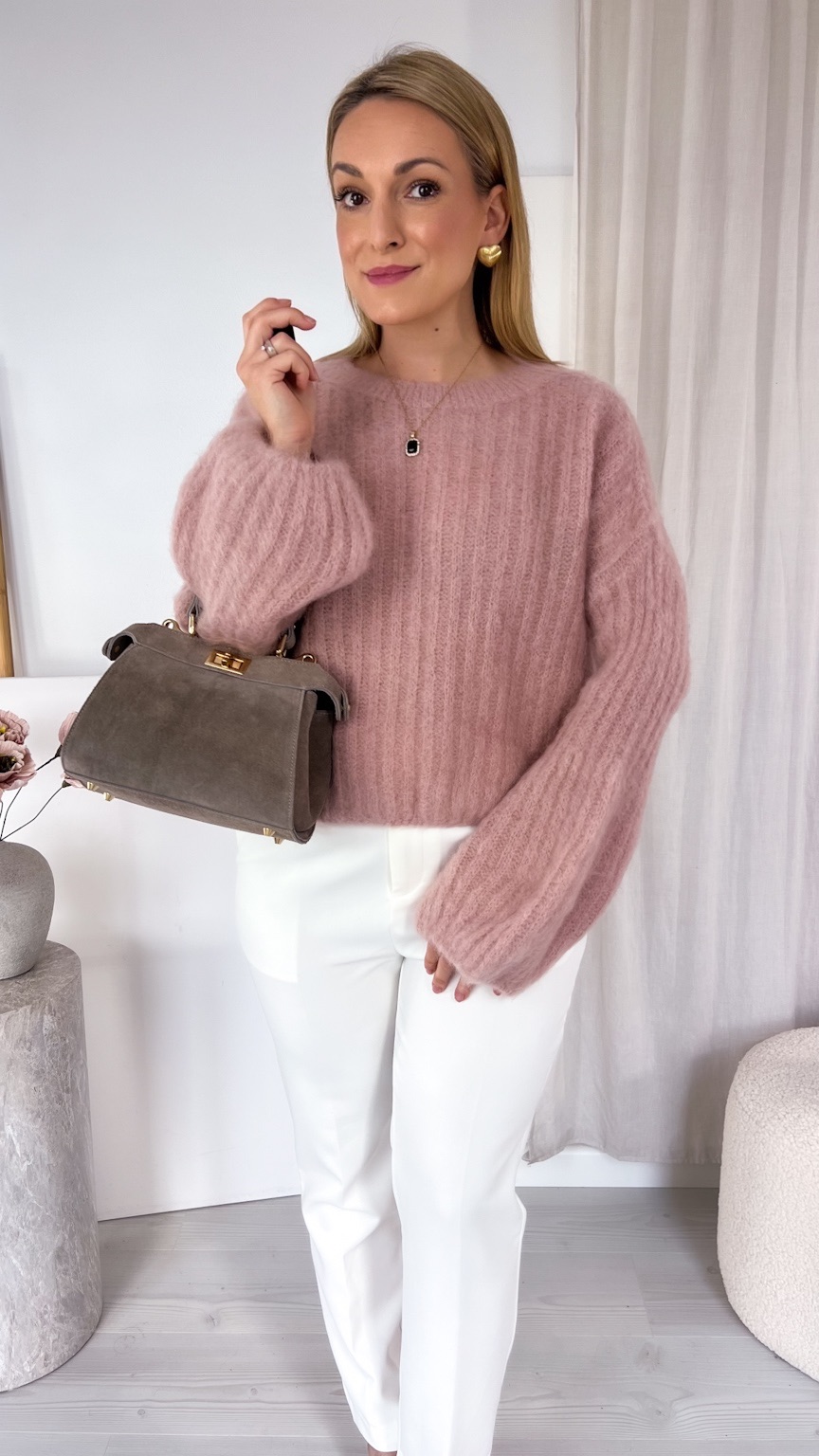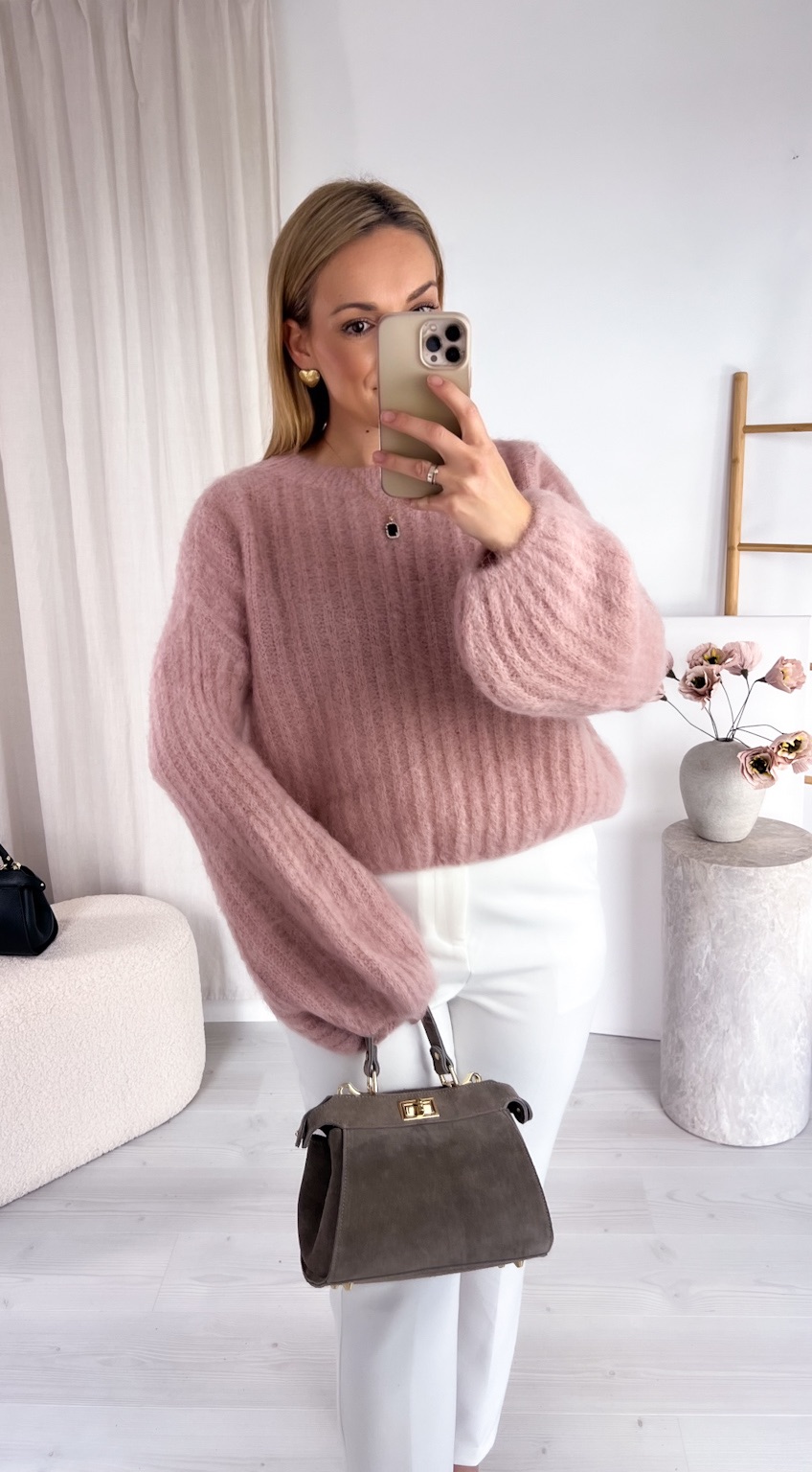 Dodaj swojej stylizacji nutę elegancji i lekkości dzięki wyjątkowemu swetrowi wykonanemu z domieszką moheru. To model zakładany przez głowę, o klasycznym prążkowanym splocie, który pięknie dopasowuje się do sylwetki. Jego charakterystycznym detalem są szeroko rozszerzane rękawy – efektowne i kobiece, nadają całości subtelnej nonszalancji.