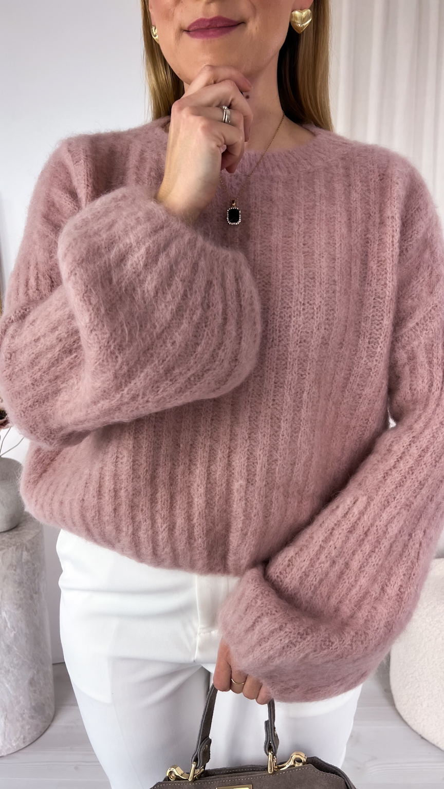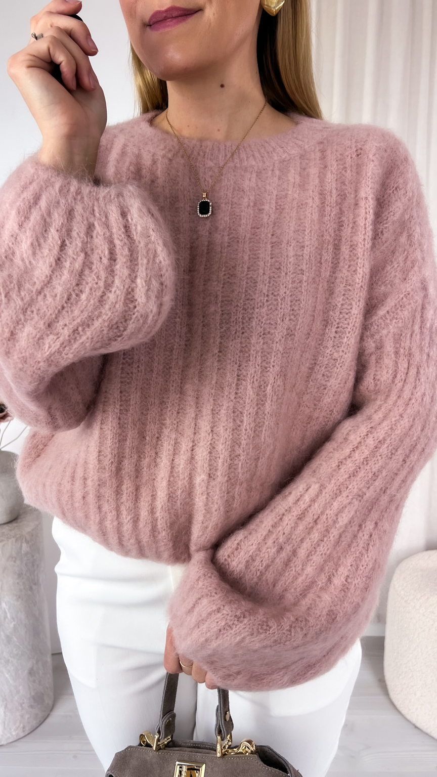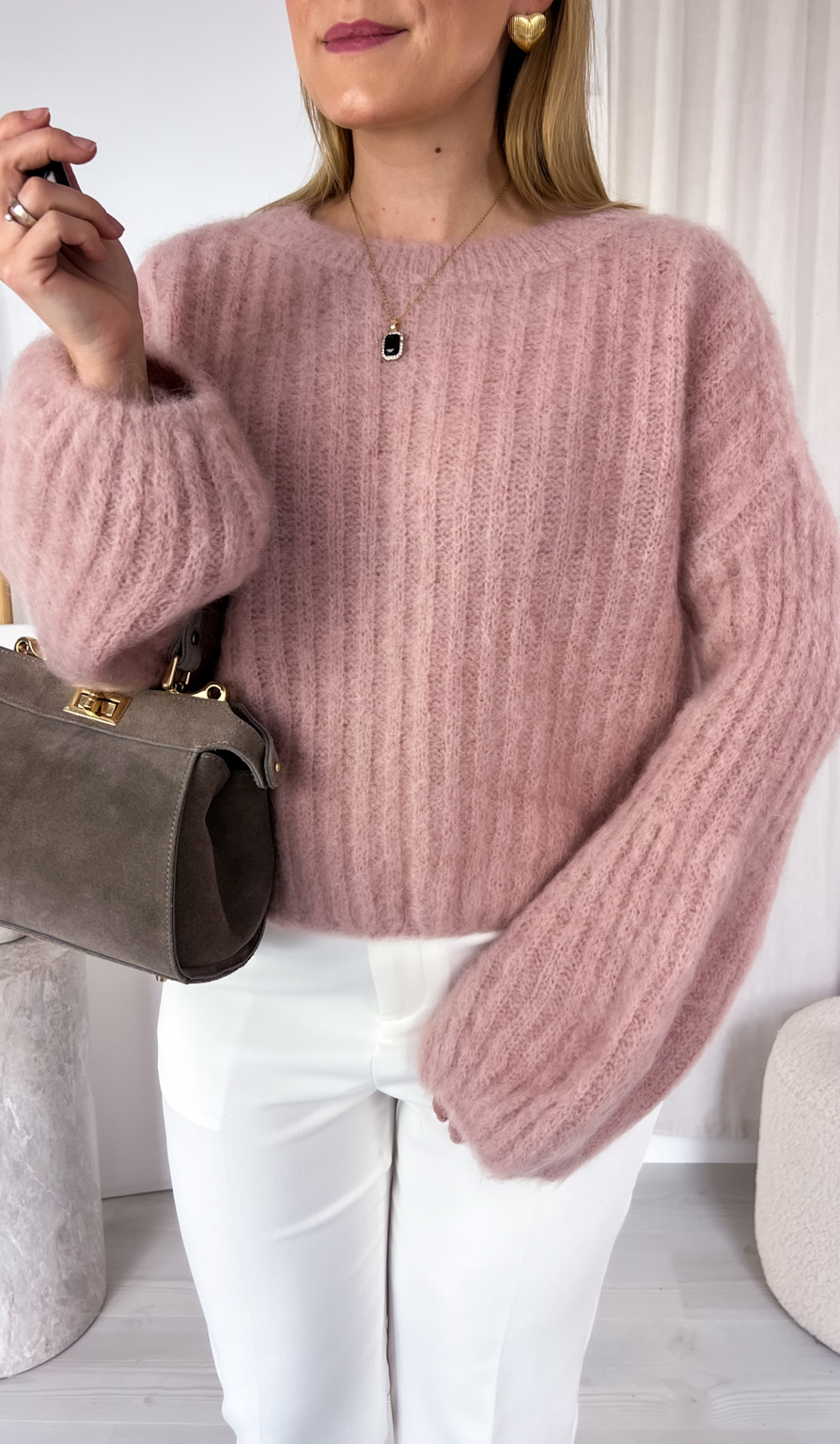 Dodaj swojej stylizacji nutę elegancji i lekkości dzięki wyjątkowemu swetrowi wykonanemu z domieszką moheru. To model zakładany przez głowę, o klasycznym prążkowanym splocie, który pięknie dopasowuje się do sylwetki. Jego charakterystycznym detalem są szeroko rozszerzane rękawy – efektowne i kobiece, nadają całości subtelnej nonszalancji.