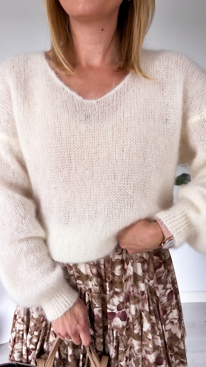 Elegancja i komfort w najlepszym wydaniu! Ten sweterek wykonany z delikatnego moheru zachwyca lekkością, puszystą fakturą i subtelnym połyskiem. Dekolt w kształcie litery V pięknie podkreśla szyję i wysmukla sylwetkę, a klasyczny fason sprawia, że model pasuje zarówno do jeansów, jak i do spódnic czy eleganckich spodni.
