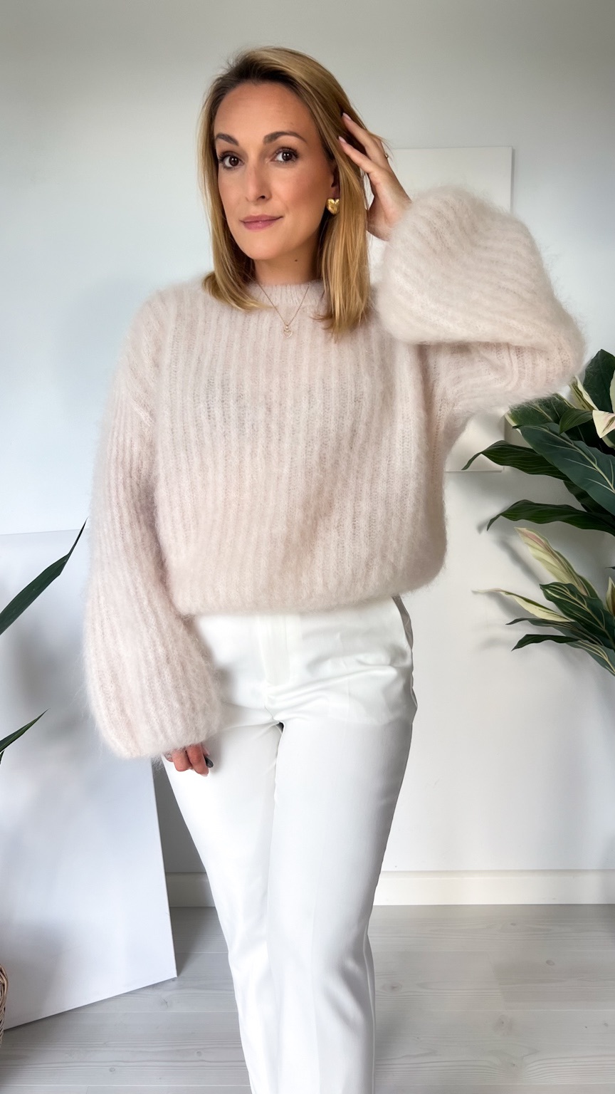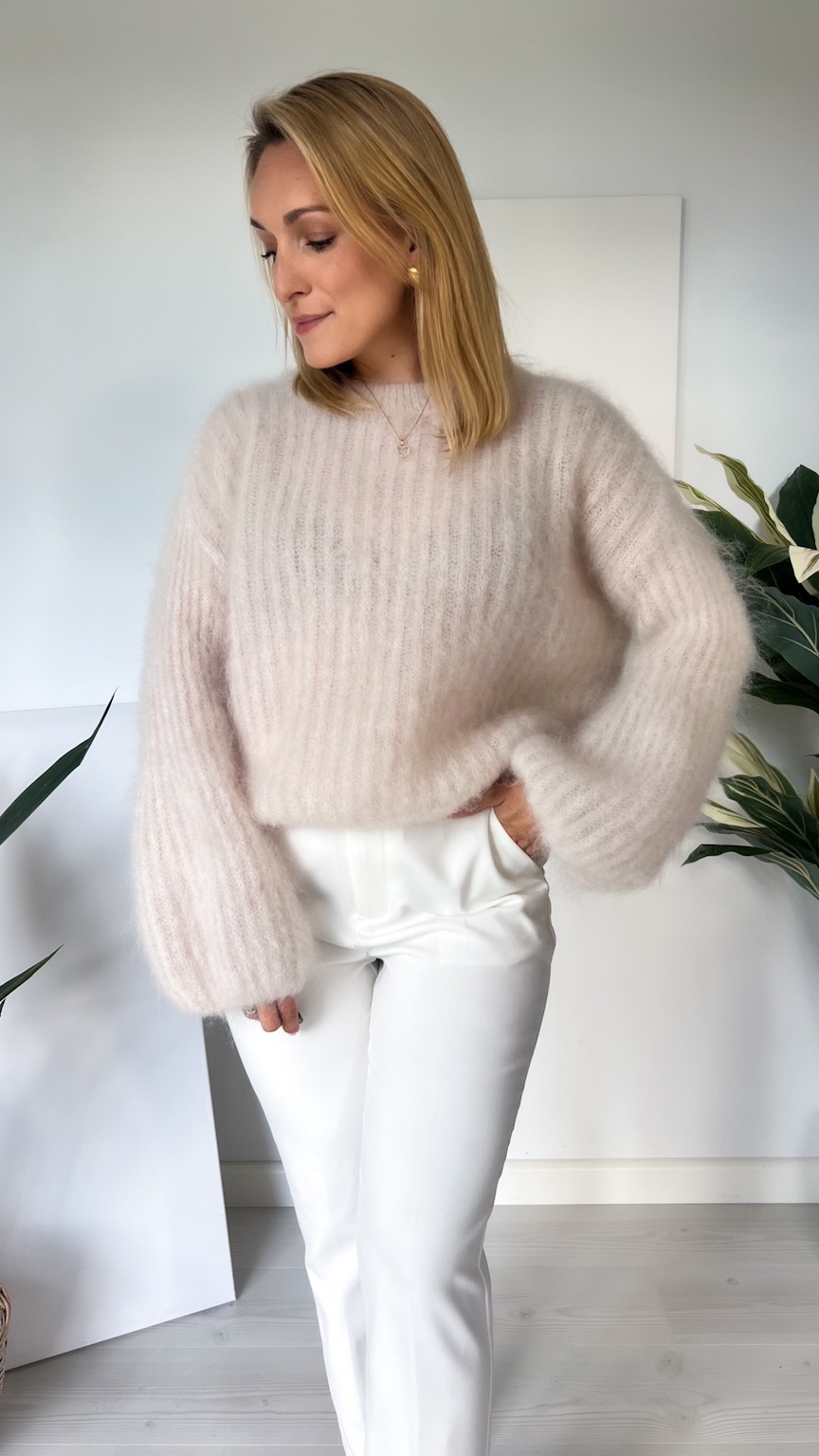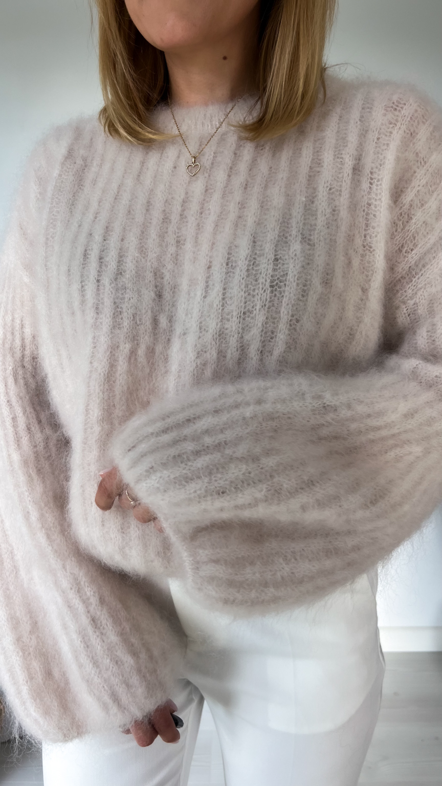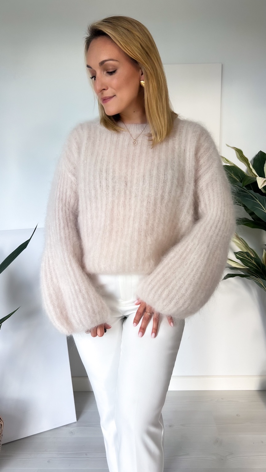 Dodaj swojej stylizacji nutę elegancji i lekkości dzięki wyjątkowemu swetrowi wykonanemu z domieszką moheru. To model zakładany przez głowę, o klasycznym prążkowanym splocie, który pięknie dopasowuje się do sylwetki. Jego charakterystycznym detalem są szeroko rozszerzane rękawy – efektowne i kobiece, nadają całości subtelnej nonszalancji.