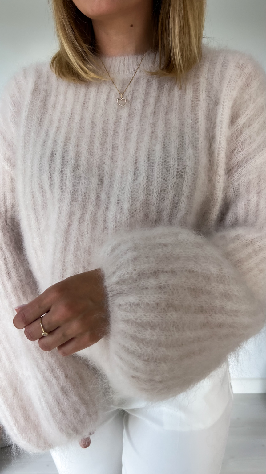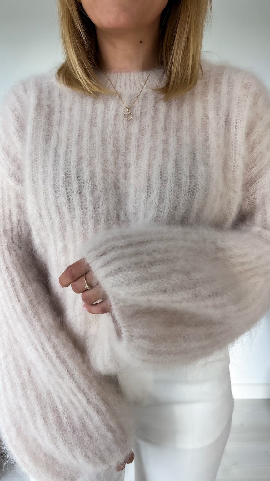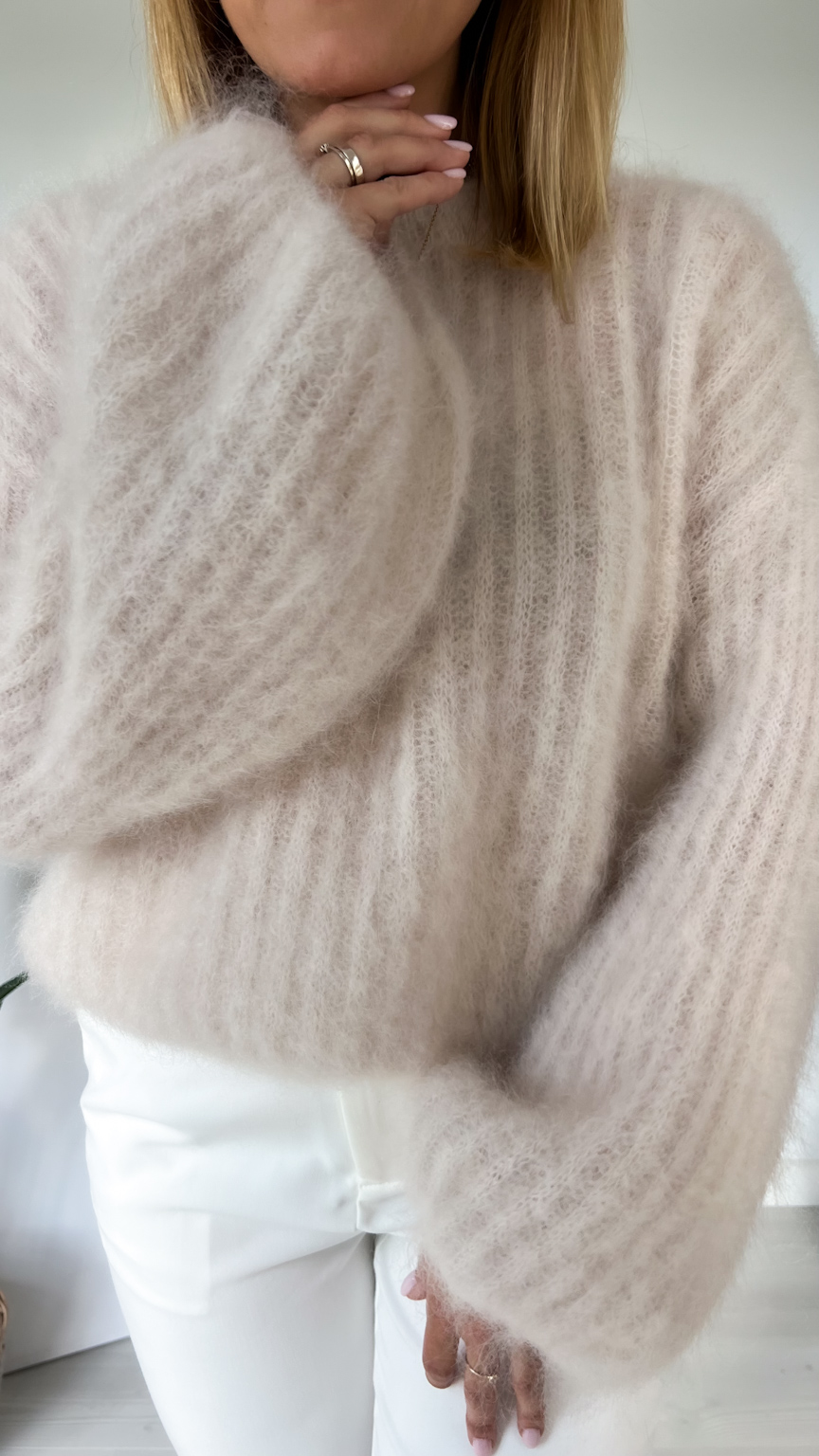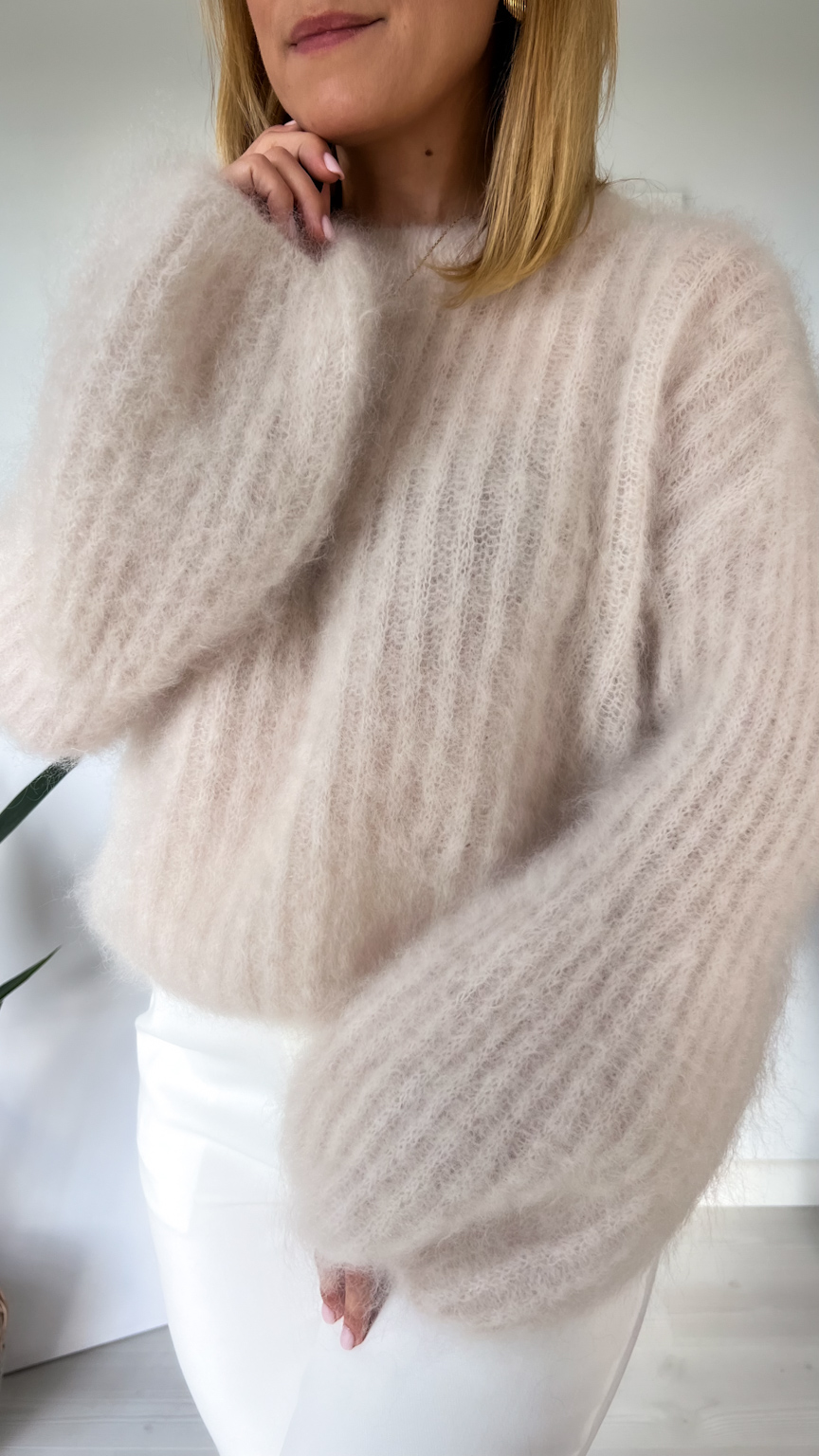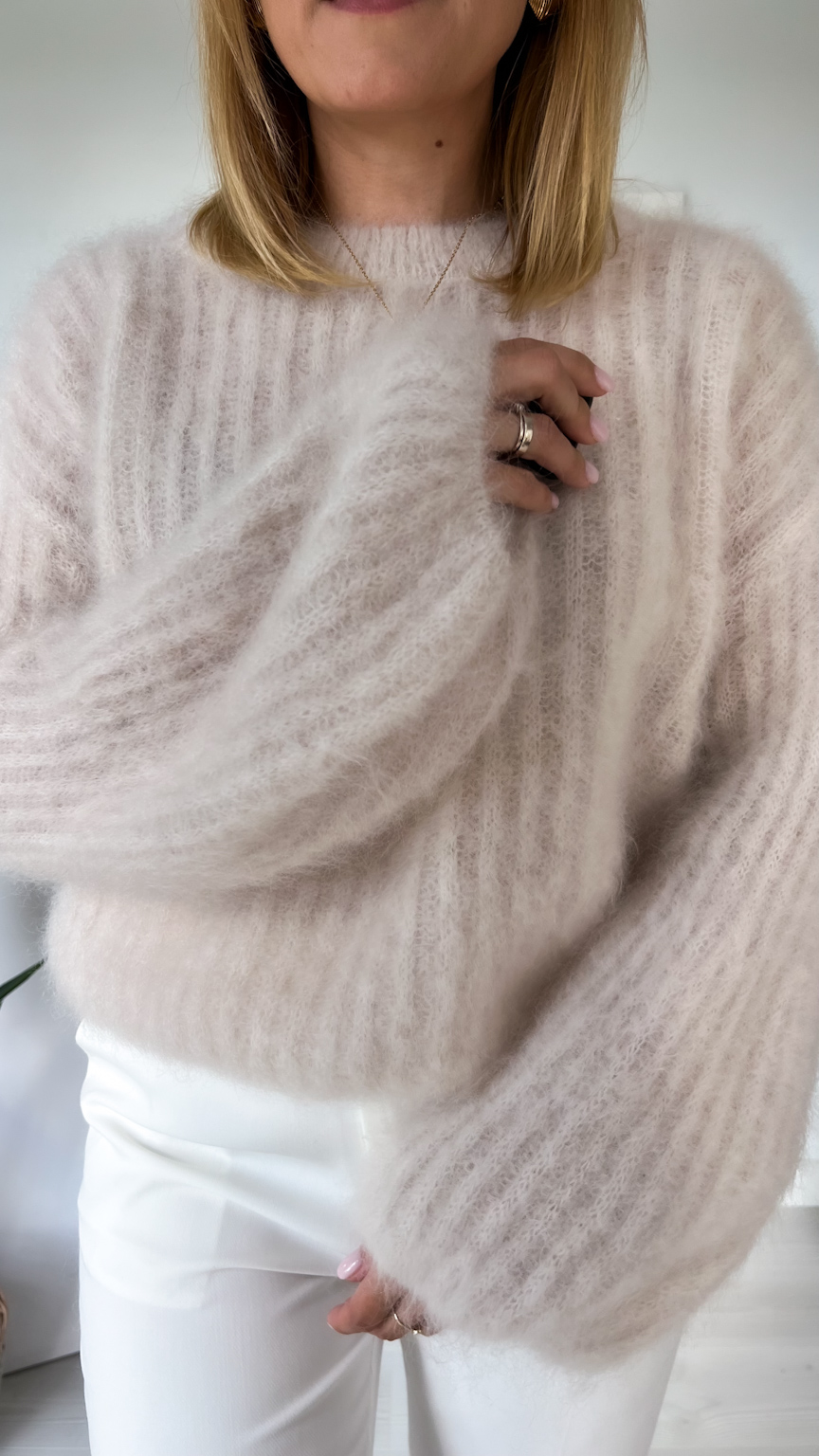Dodaj swojej stylizacji nutę elegancji i lekkości dzięki wyjątkowemu swetrowi wykonanemu z domieszką moheru. To model zakładany przez głowę, o klasycznym prążkowanym splocie, który pięknie dopasowuje się do sylwetki. Jego charakterystycznym detalem są szeroko rozszerzane rękawy – efektowne i kobiece, nadają całości subtelnej nonszalancji.