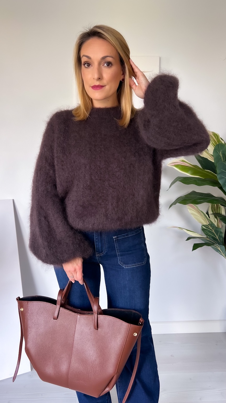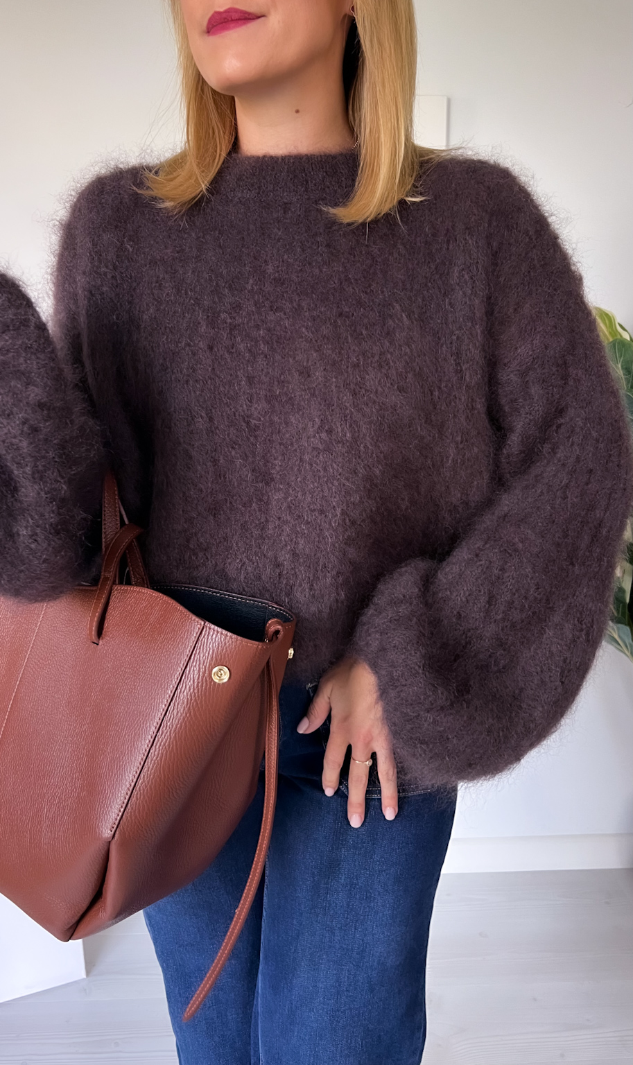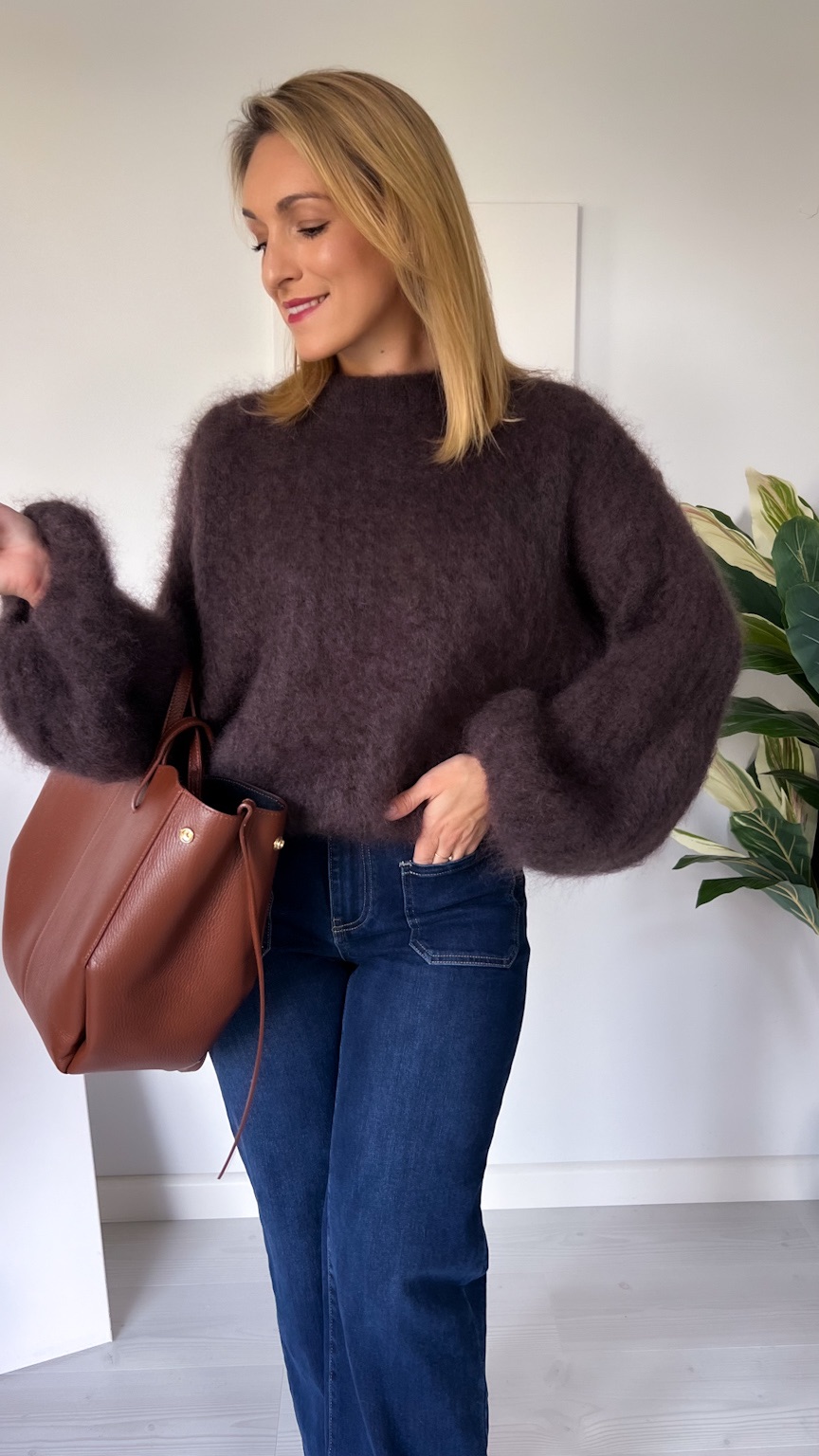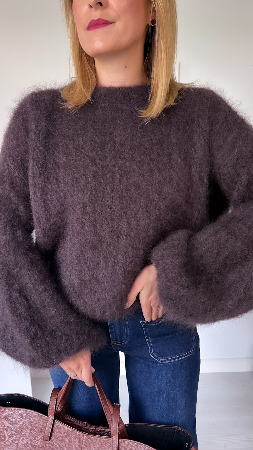 Dodaj swojej stylizacji nutę elegancji i lekkości dzięki wyjątkowemu swetrowi wykonanemu z domieszką moheru. To model zakładany przez głowę, o klasycznym prążkowanym splocie, który pięknie dopasowuje się do sylwetki. Jego charakterystycznym detalem są szeroko rozszerzane rękawy – efektowne i kobiece, nadają całości subtelnej nonszalancji.