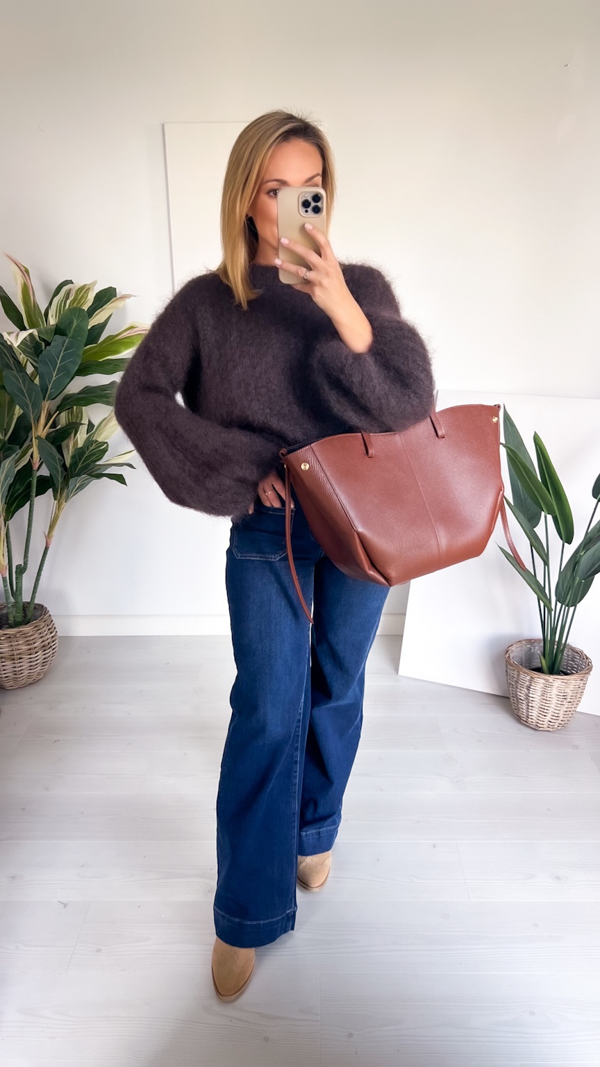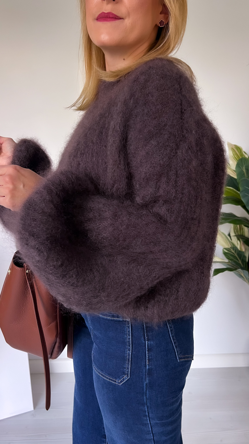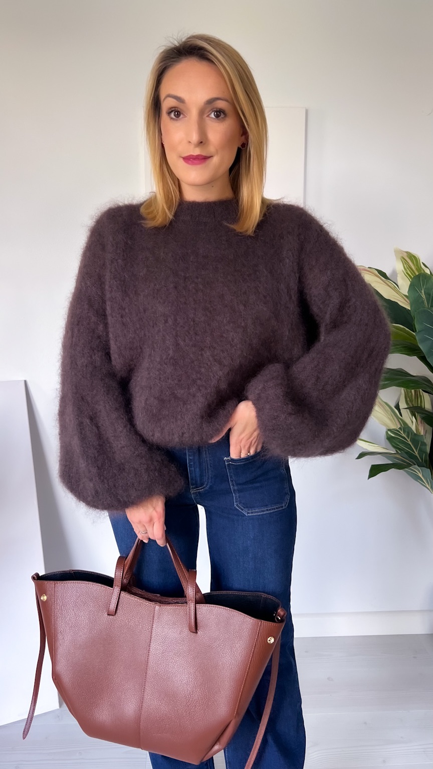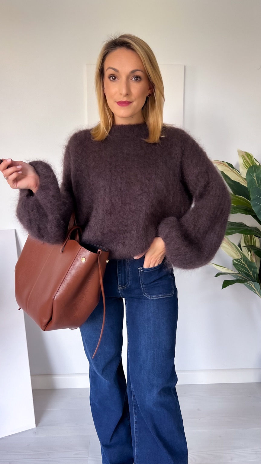 Dodaj swojej stylizacji nutę elegancji i lekkości dzięki wyjątkowemu swetrowi wykonanemu z domieszką moheru. To model zakładany przez głowę, o klasycznym prążkowanym splocie, który pięknie dopasowuje się do sylwetki. Jego charakterystycznym detalem są szeroko rozszerzane rękawy – efektowne i kobiece, nadają całości subtelnej nonszalancji.