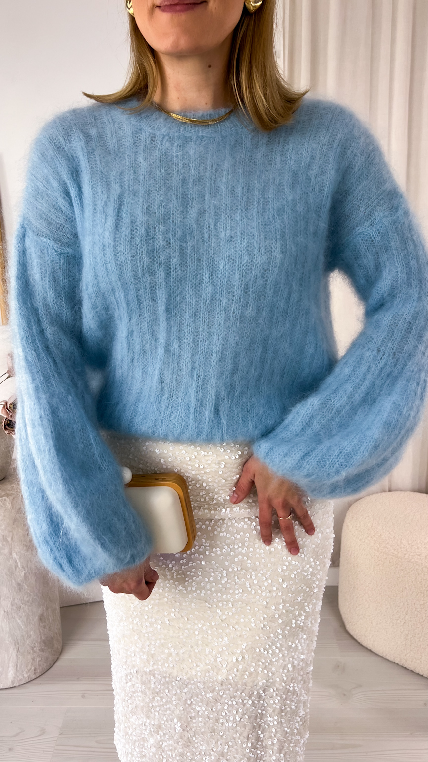 Dodaj swojej stylizacji nutę elegancji i lekkości dzięki wyjątkowemu swetrowi wykonanemu z domieszką moheru. To model zakładany przez głowę, o klasycznym prążkowanym splocie, który pięknie dopasowuje się do sylwetki. Jego charakterystycznym detalem są szeroko rozszerzane rękawy – efektowne i kobiece, nadają całości subtelnej nonszalancji.
