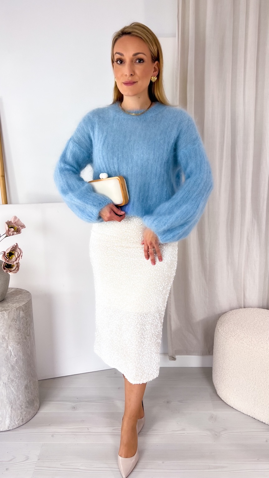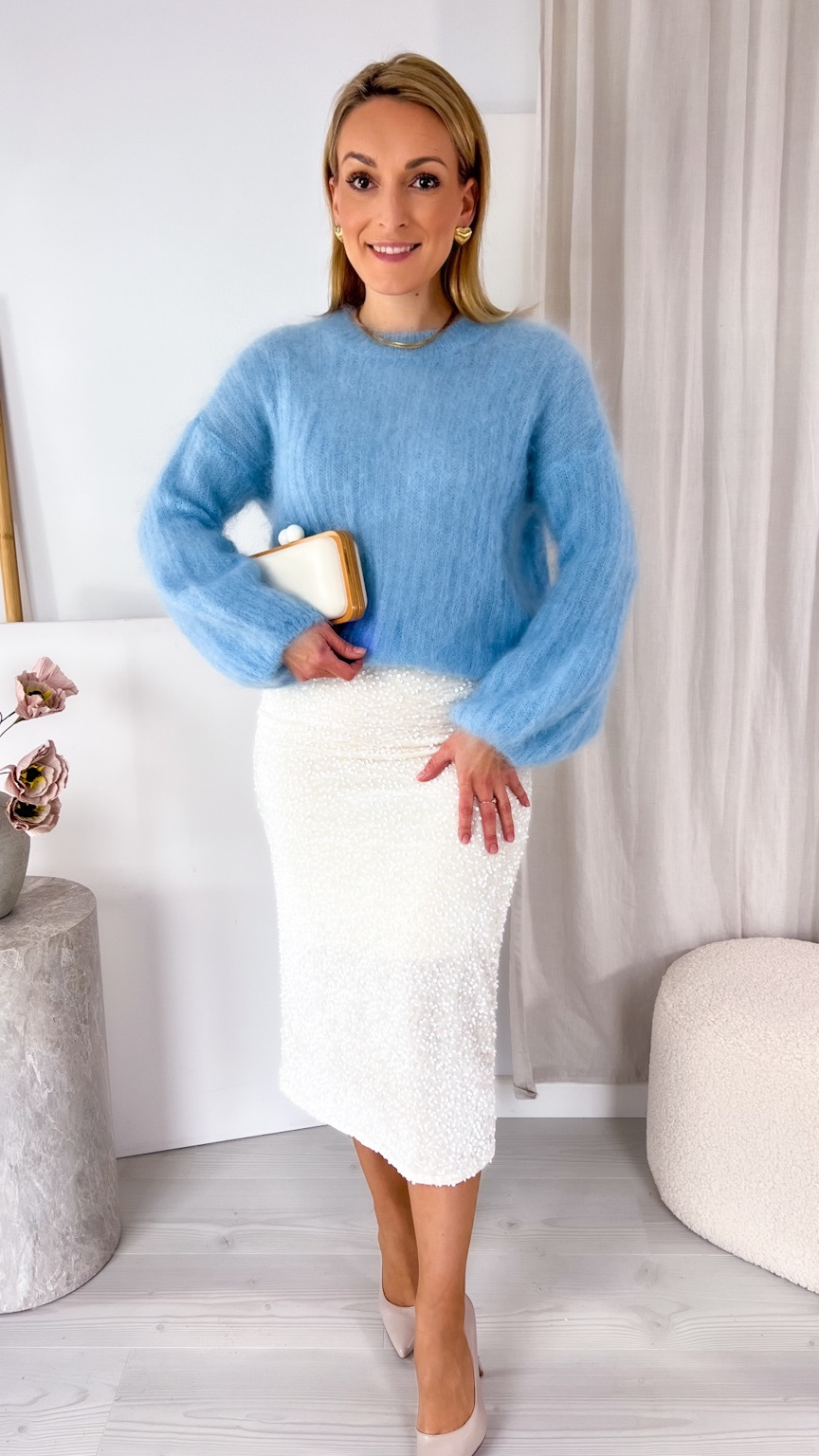 Moher to naturalne włókno pozyskiwane z kóz angorskich, cenione od stuleci za swoje luksusowe właściwości. Jest niezwykle miękki, puszysty i lekki, a przy tym wyjątkowo trwały. Dzięki naturalnemu połyskowi nadaje ubraniom szlachetny charakter i sprawia, że prezentują się elegancko w każdej stylizacji. Dodatkowo moher zapewnia doskonałą termoregulację – grzeje w chłodne dni, ale pozostaje przewiewny i komfortowy.