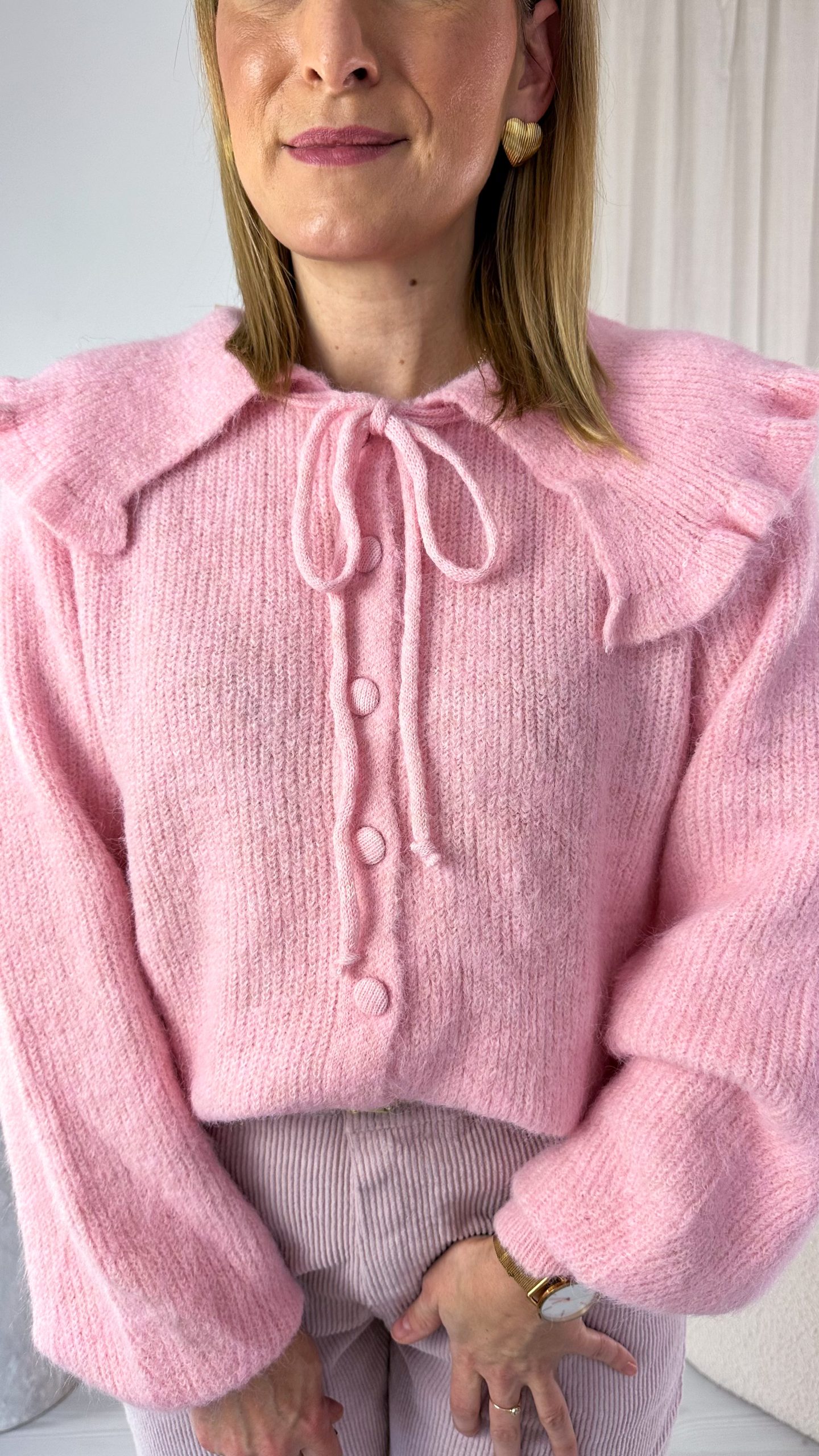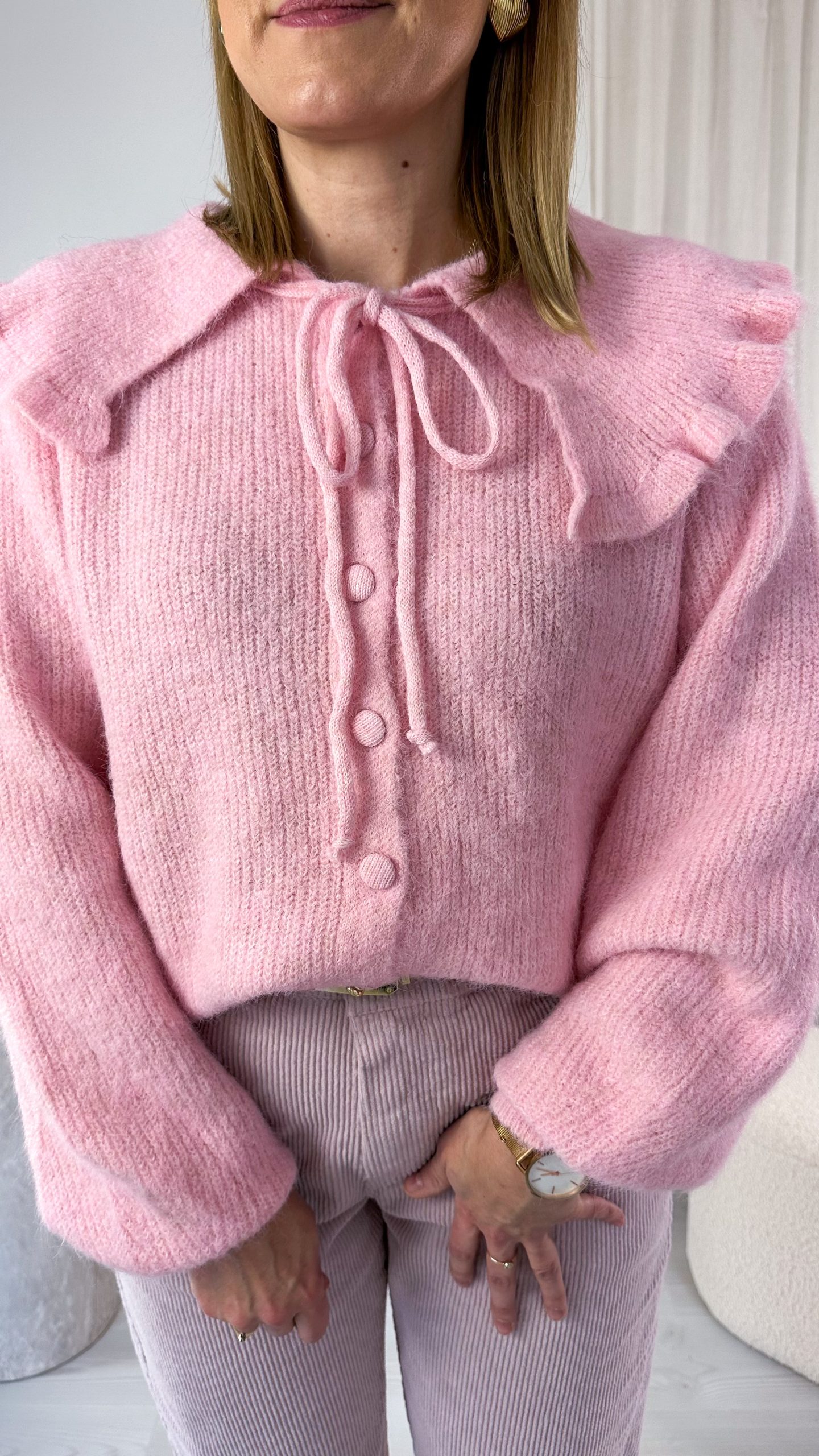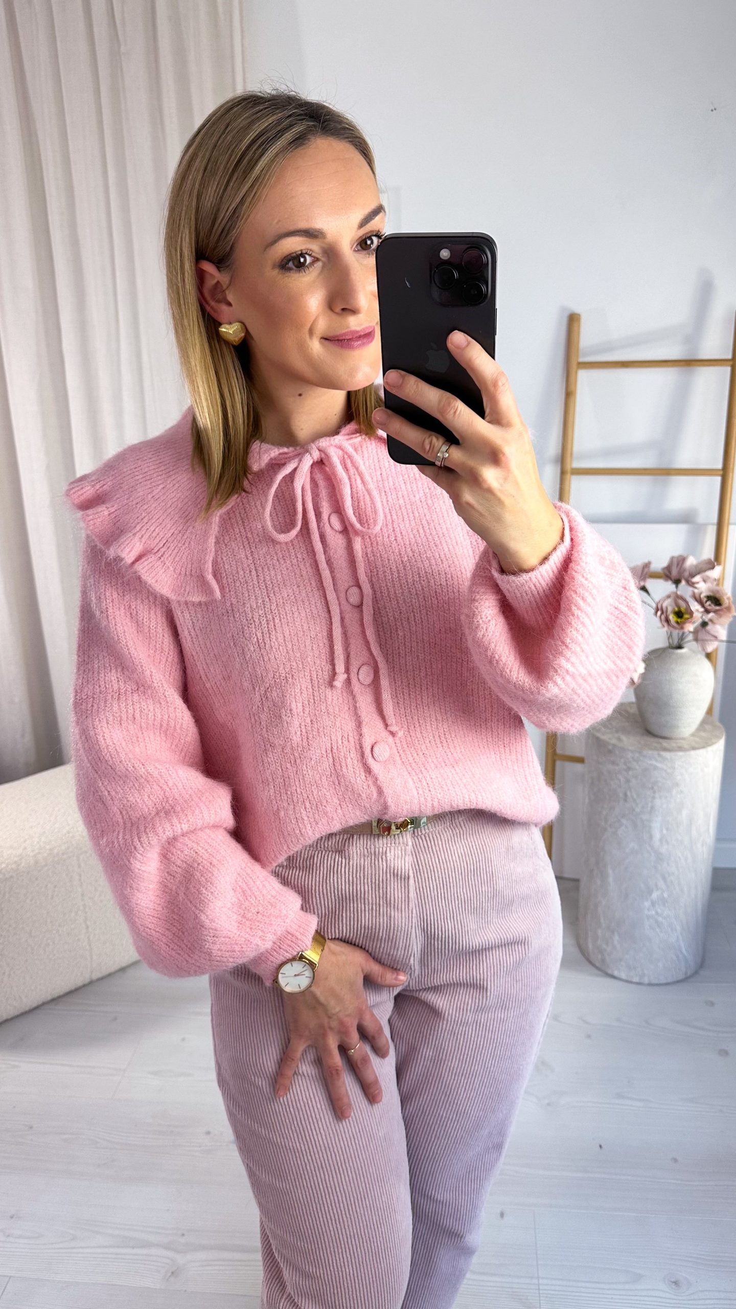 Ten wyjątkowy sweterek to połączenie klasycznej elegancji i dziewczęcego uroku. Duży, ozdobny kołnierz nadaje mu wyjątkowy charakter, a zapinanie na guziki dodaje mu delikatnej, retro nuty. Model został wzbogacony o możliwość zawiązania pod szyją — dzięki temu możesz stworzyć efektowną kokardę, która pięknie podkreśla kobiecość i nadaje stylizacji niepowtarzalnego wdzięku.