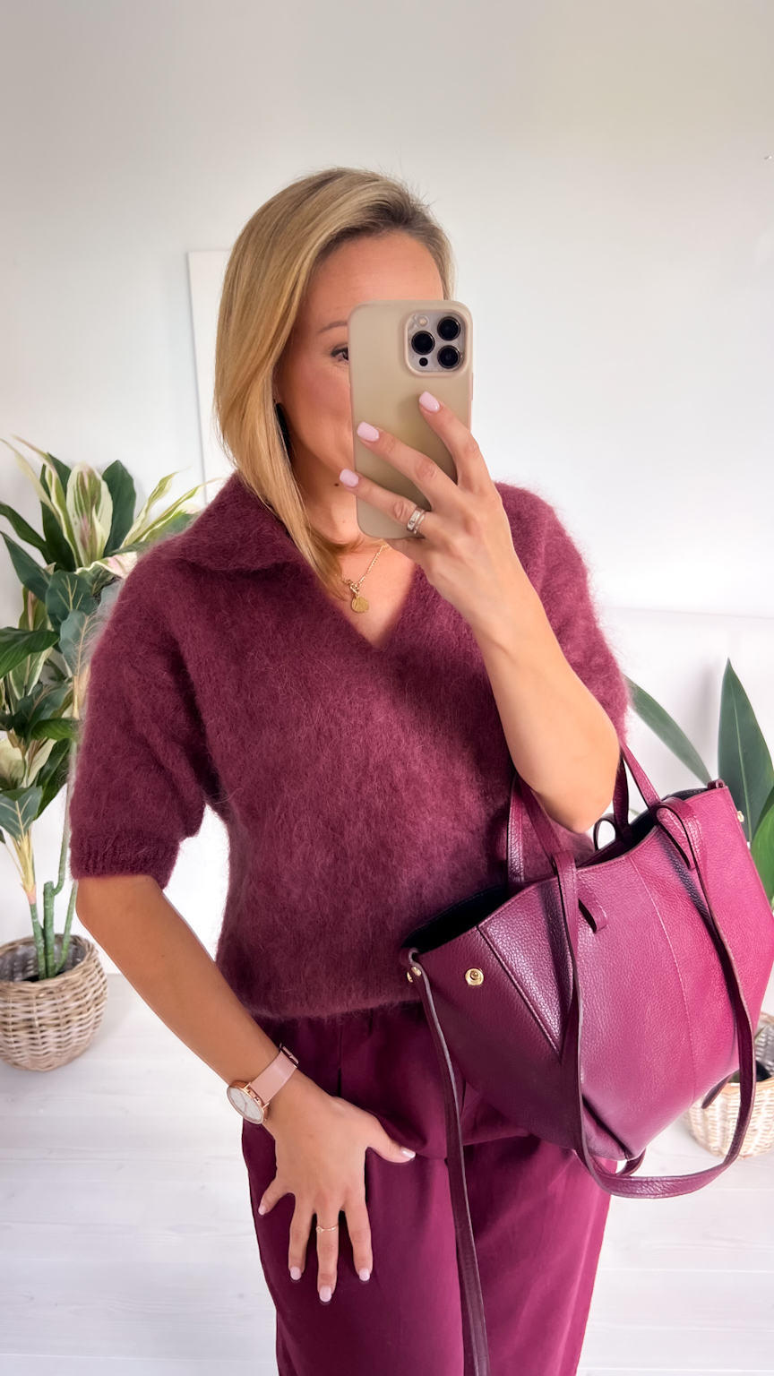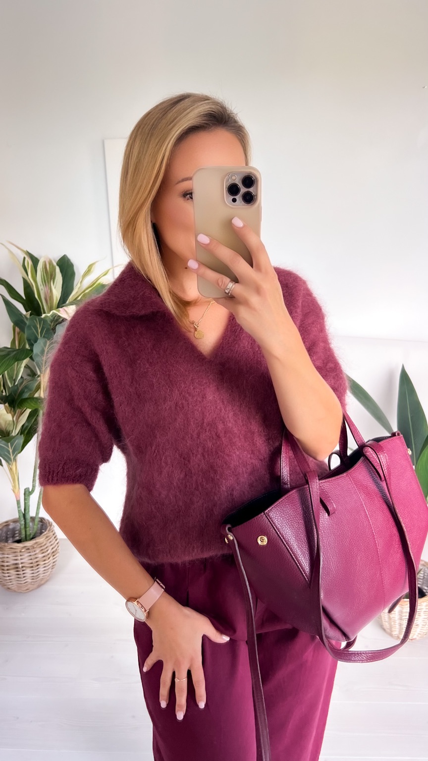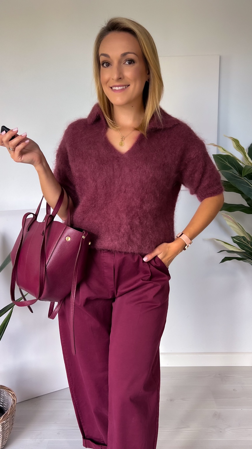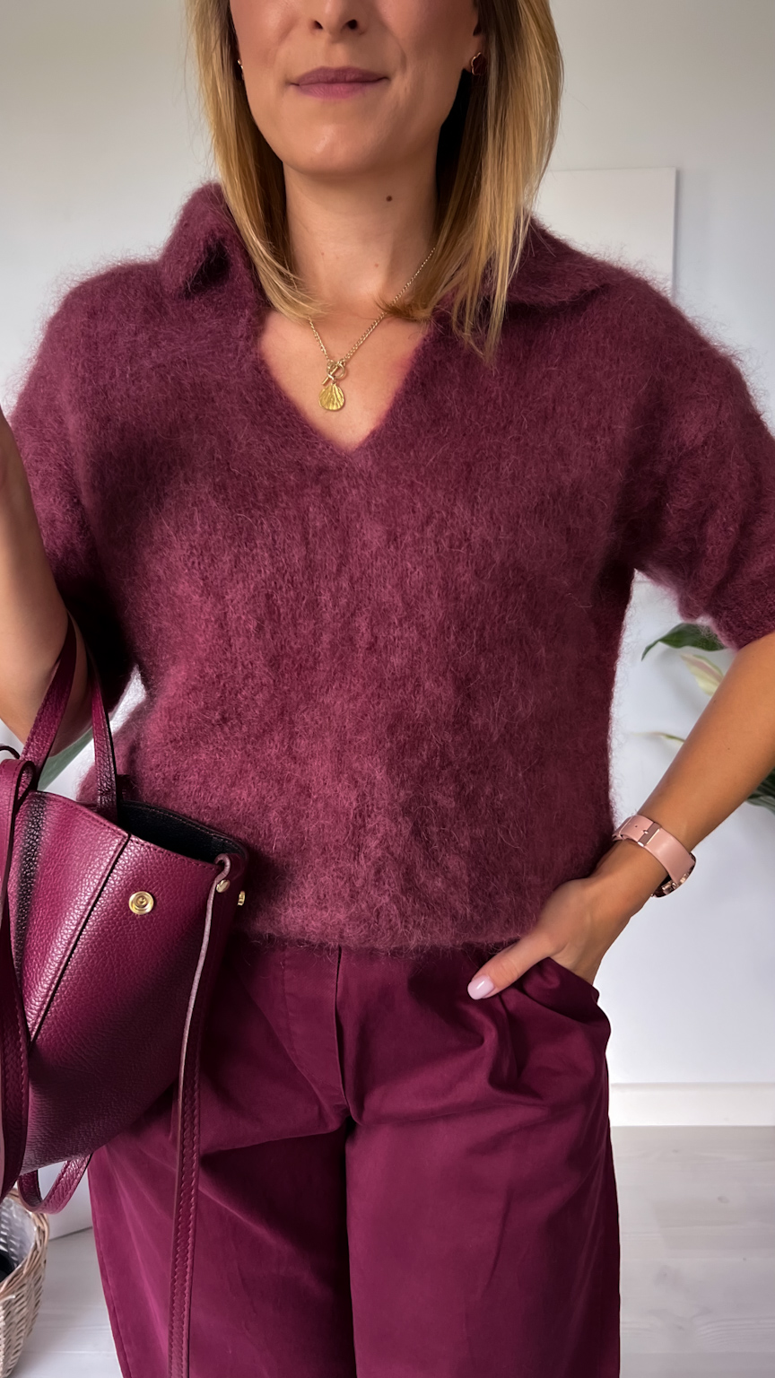 Elegancki i wyjątkowy sweter z dodatkiem moheru to propozycja, która wyróżnia się subtelnym designem i modnym charakterem. Model z krótkim rękawem, dekoltem w kształcie litery V oraz klasycznym kołnierzykiem łączy w sobie wygodę i szykowną prostotę.