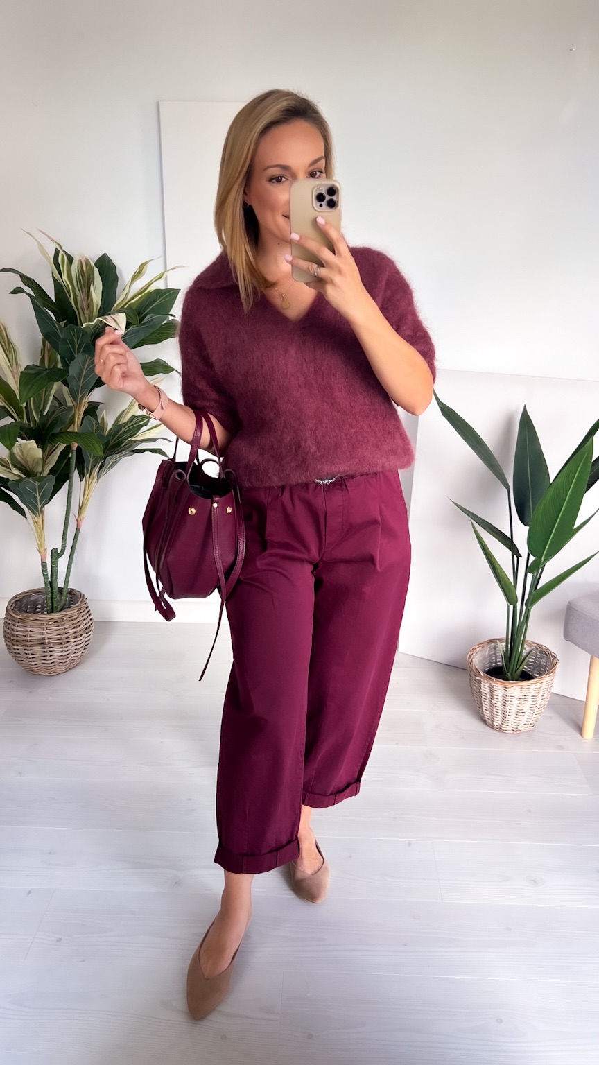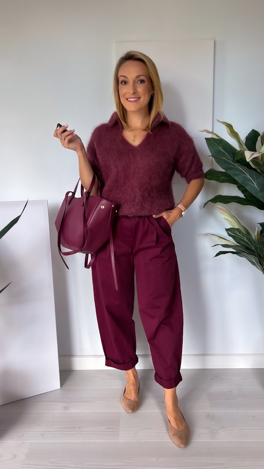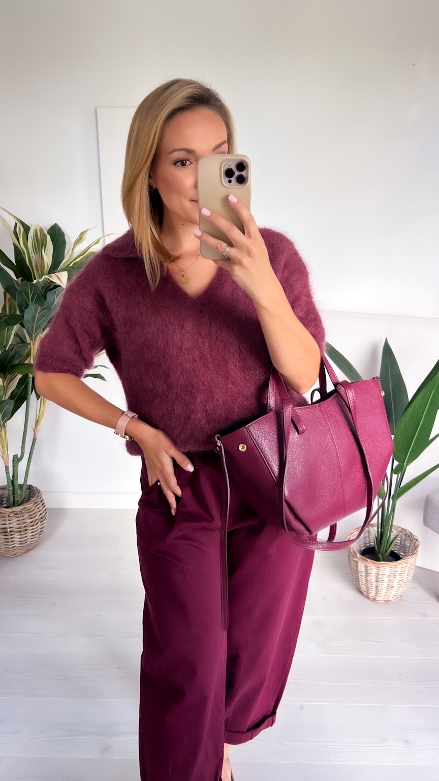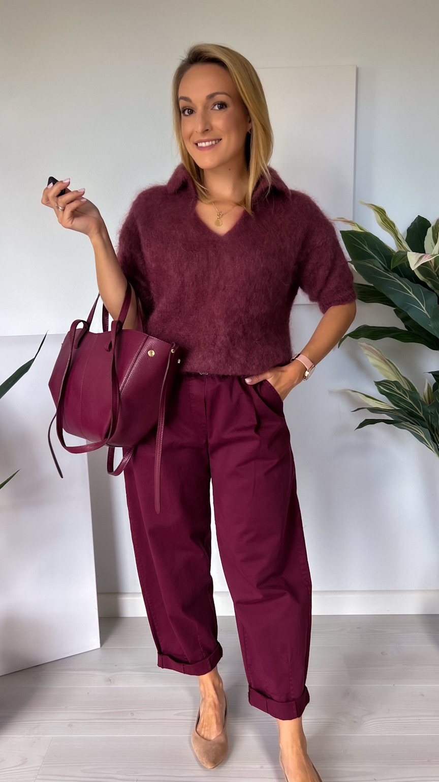 Elegancki i wyjątkowy sweter z dodatkiem moheru to propozycja, która wyróżnia się subtelnym designem i modnym charakterem. Model z krótkim rękawem, dekoltem w kształcie litery V oraz klasycznym kołnierzykiem łączy w sobie wygodę i szykowną prostotę.
