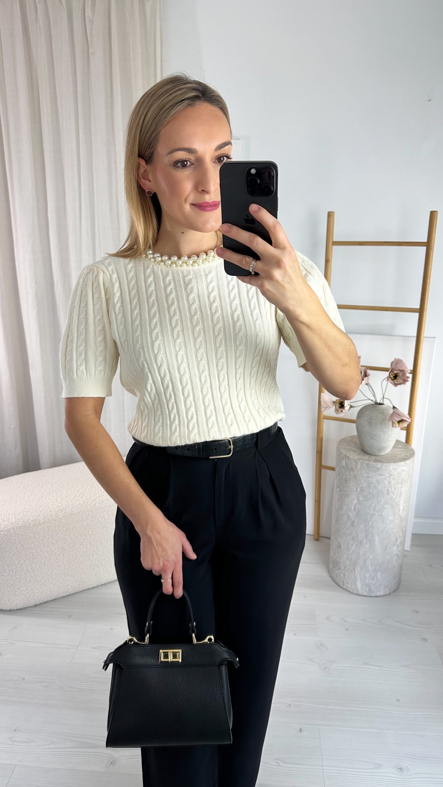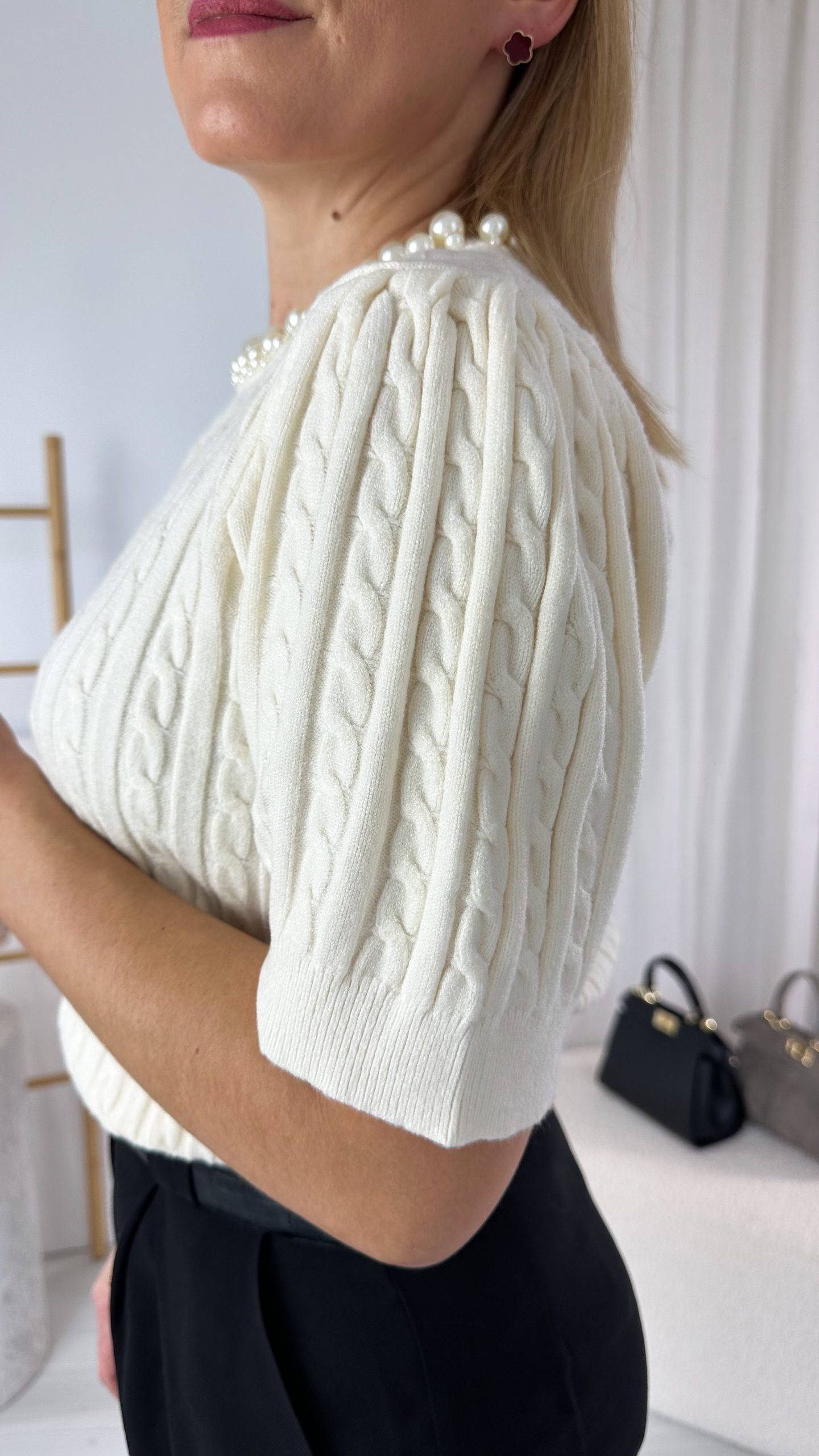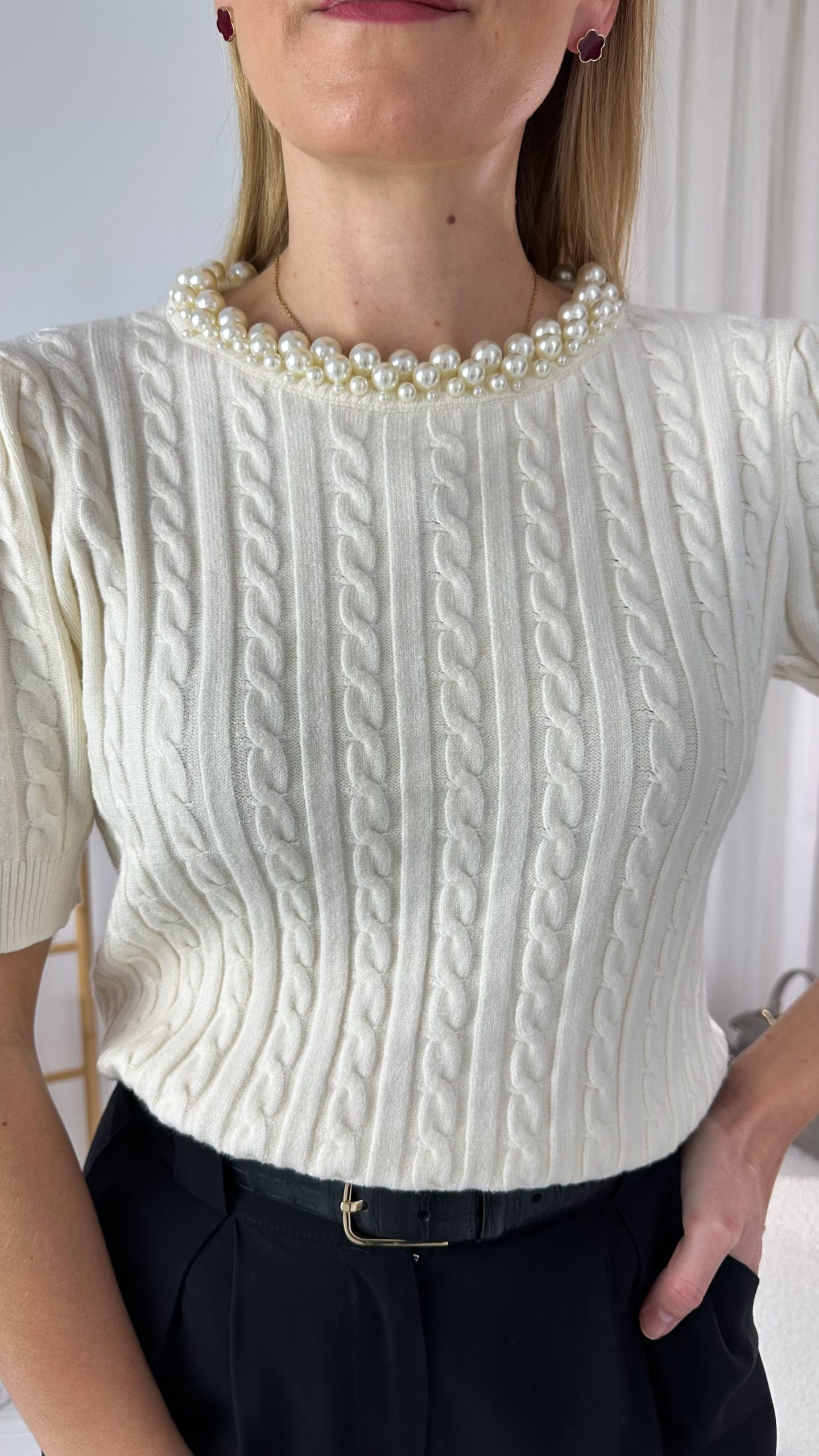 Model został wykończony pod szyją subtelnymi perełkami, które dodają całości delikatnego blasku i sprawiają, że sweterek prezentuje się niezwykle stylowo. To idealny wybór na chłodniejsze dni – zarówno do codziennych stylizacji, jak i na bardziej wyjątkowe okazje, gdy chcesz wyglądać elegancko, ale wciąż czuć się swobodnie.