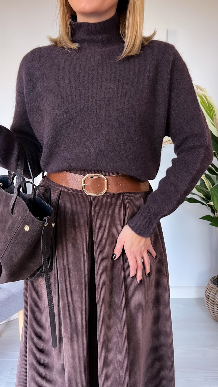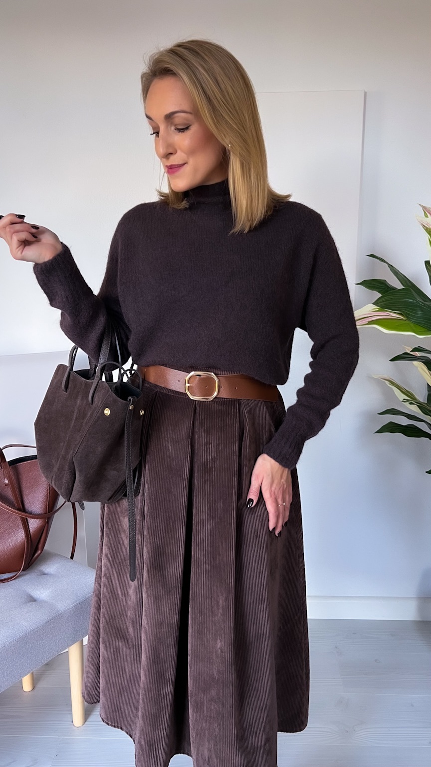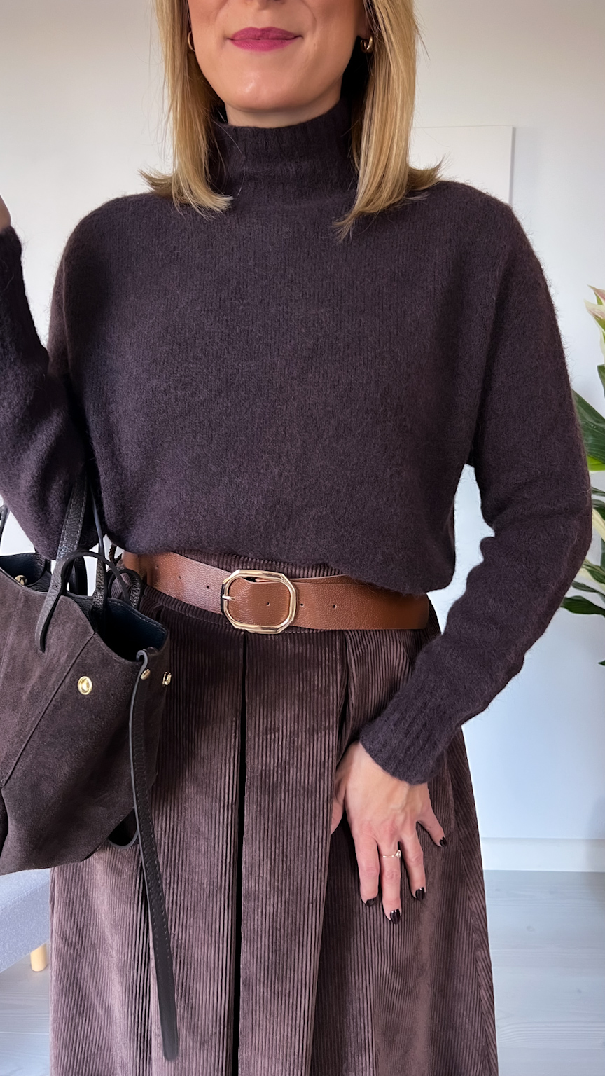 Dzięki minimalistycznemu fasonowi sweter doskonale sprawdzi się zarówno w codziennych, jak i bardziej formalnych zestawach — świetnie wygląda z jeansami, spódnicą czy eleganckimi spodniami.