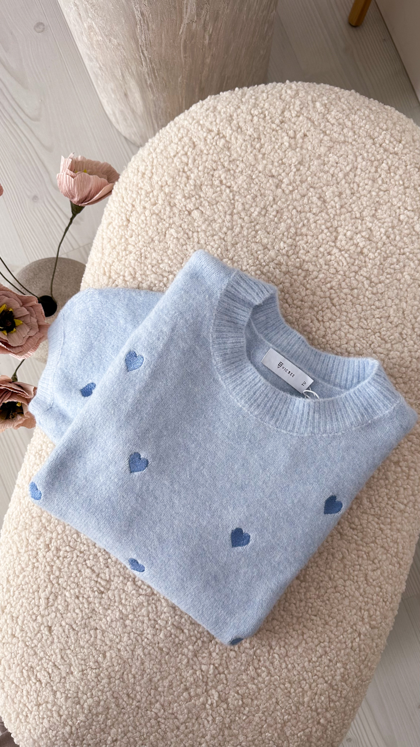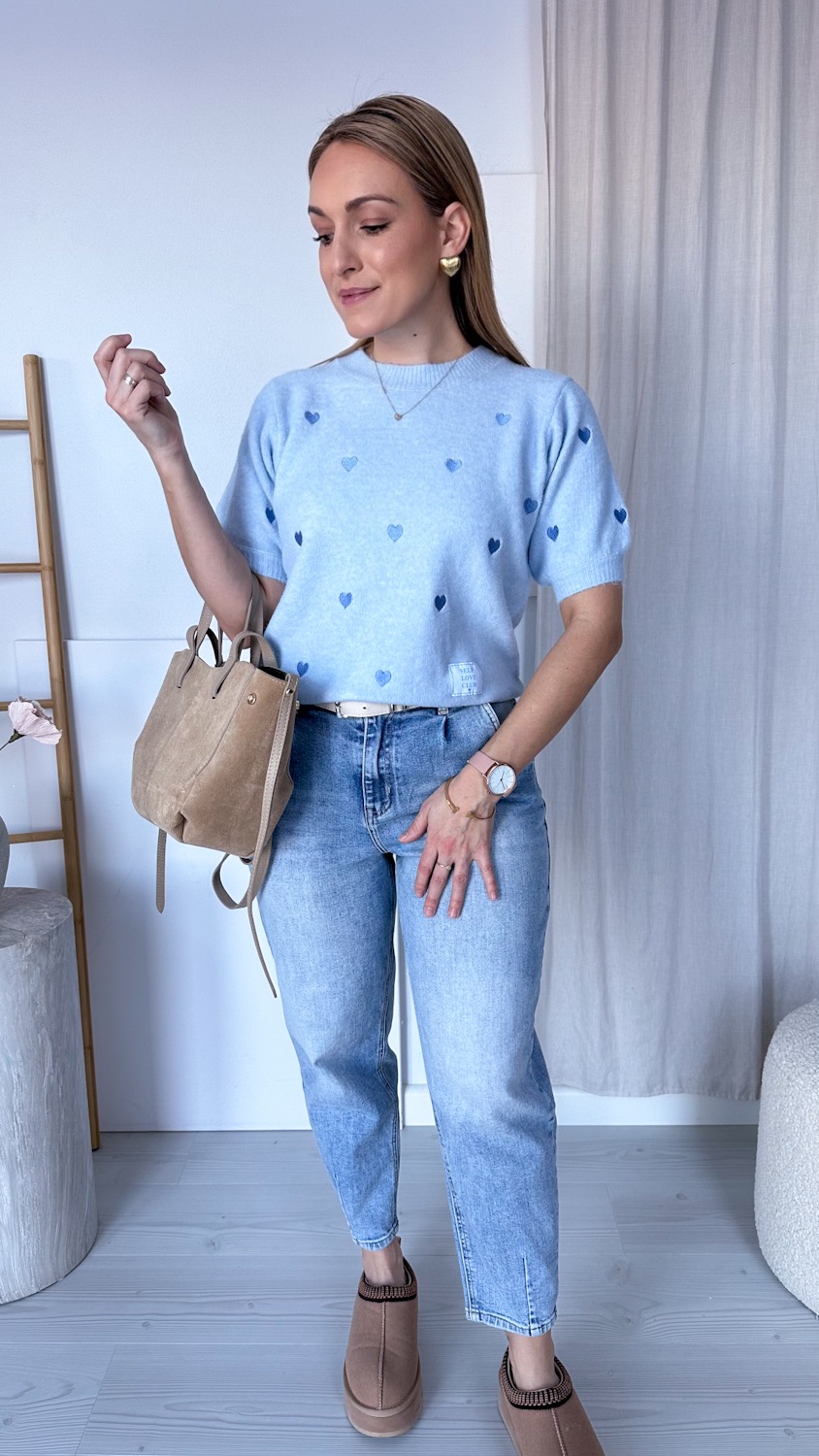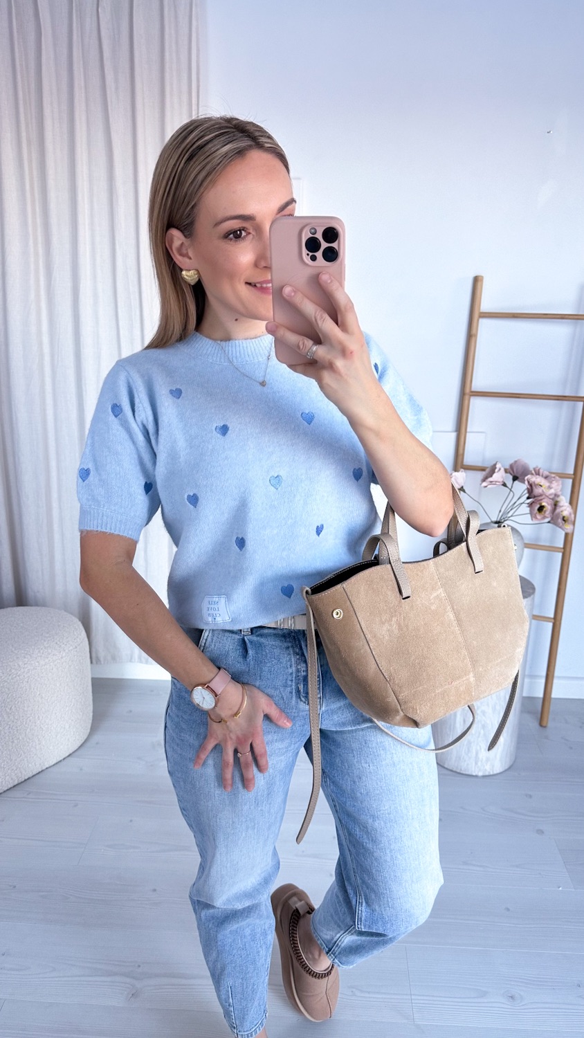 Uroczy sweterek z krótkim rękawem to idealne połączenie komfortu i subtelnej elegancji. Delikatny materiał miękko otula skórę, a haftowane serduszka dodają całości romantycznego charakteru. Krótki rękaw sprawia, że model świetnie sprawdzi się zarówno w cieplejsze dni, jak i jako element stylizacji warstwowej.