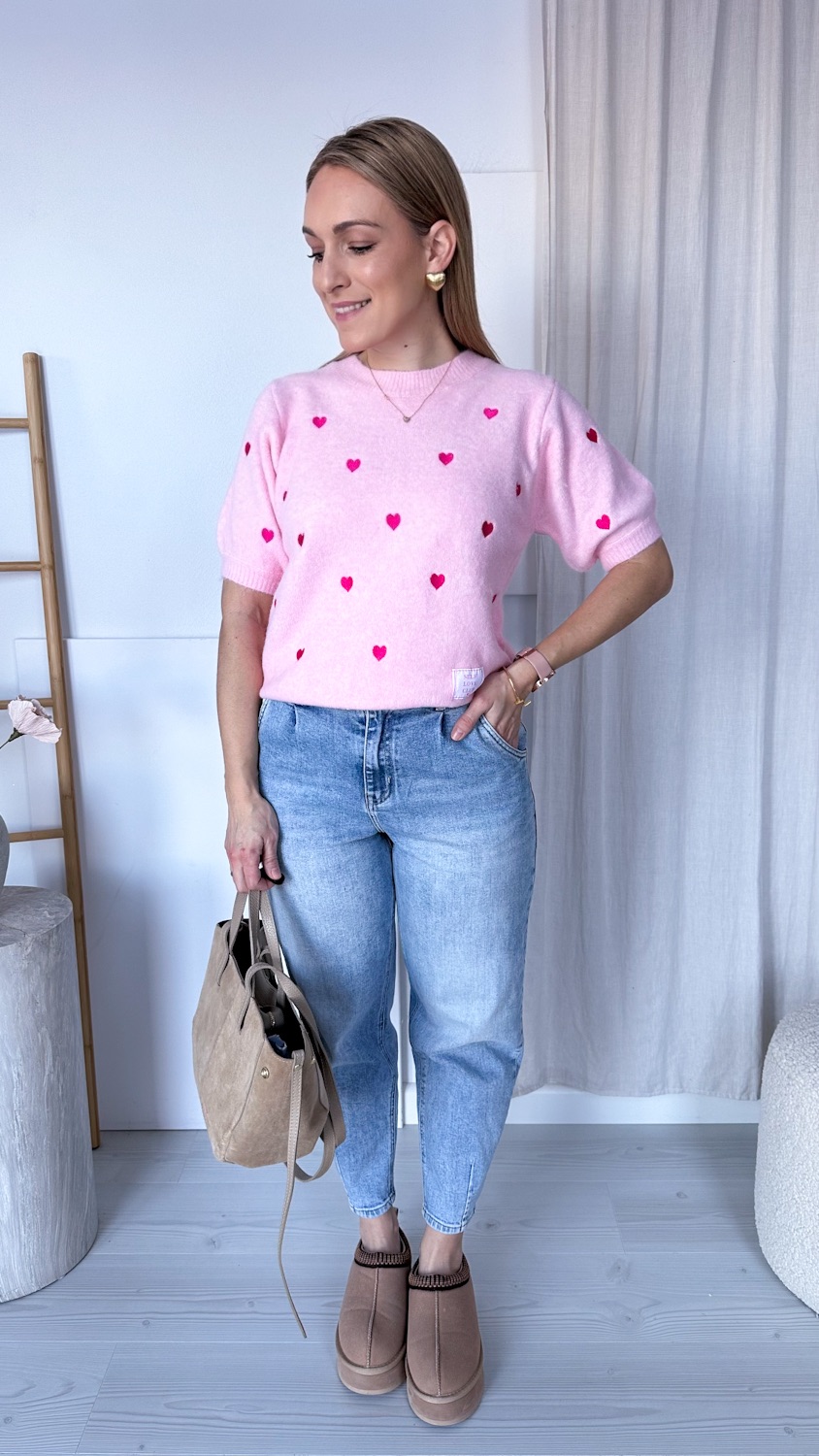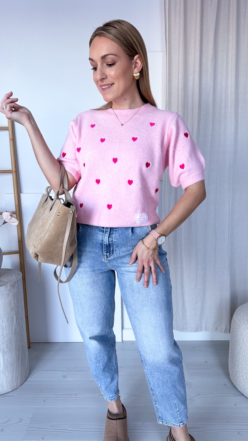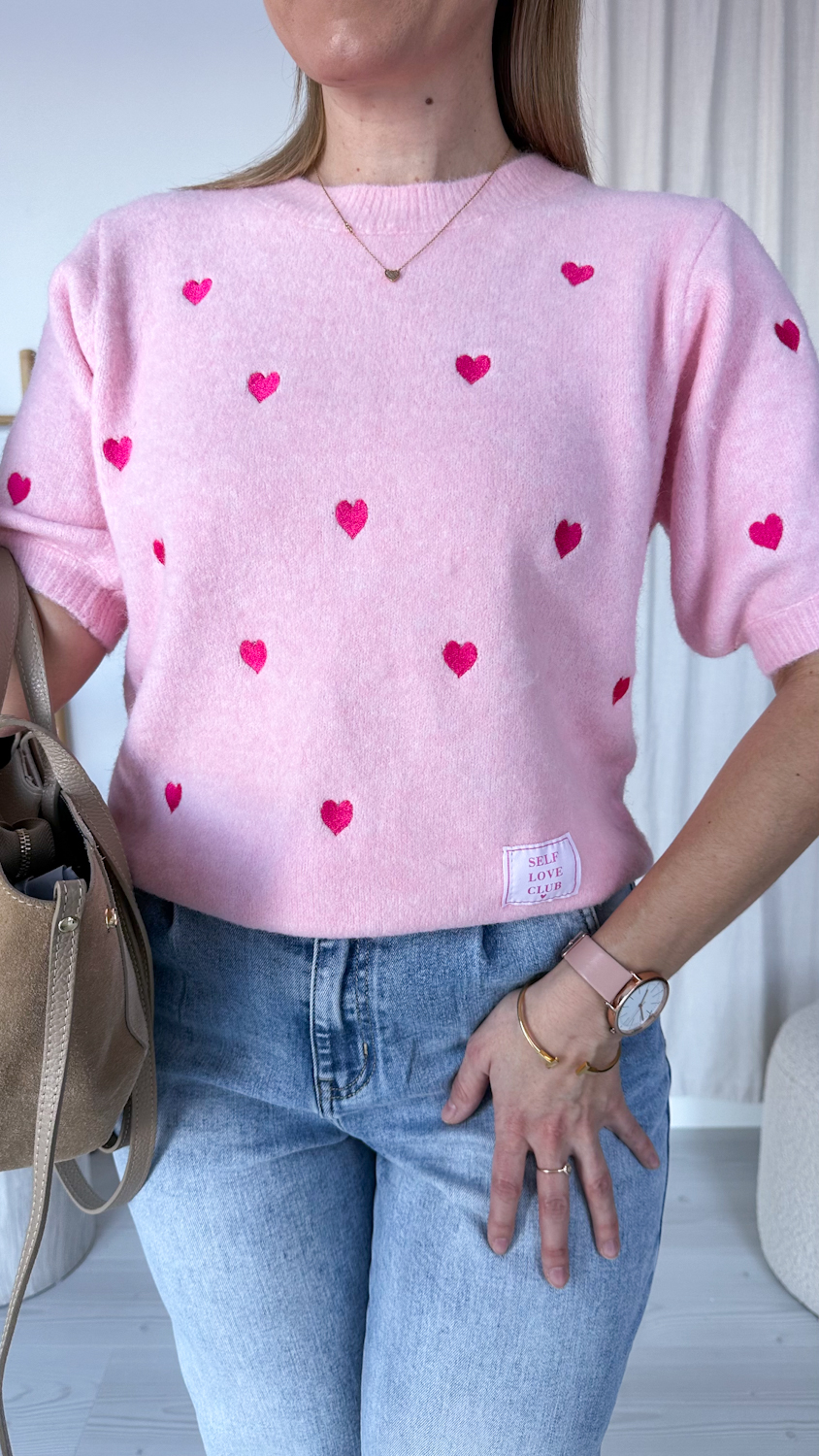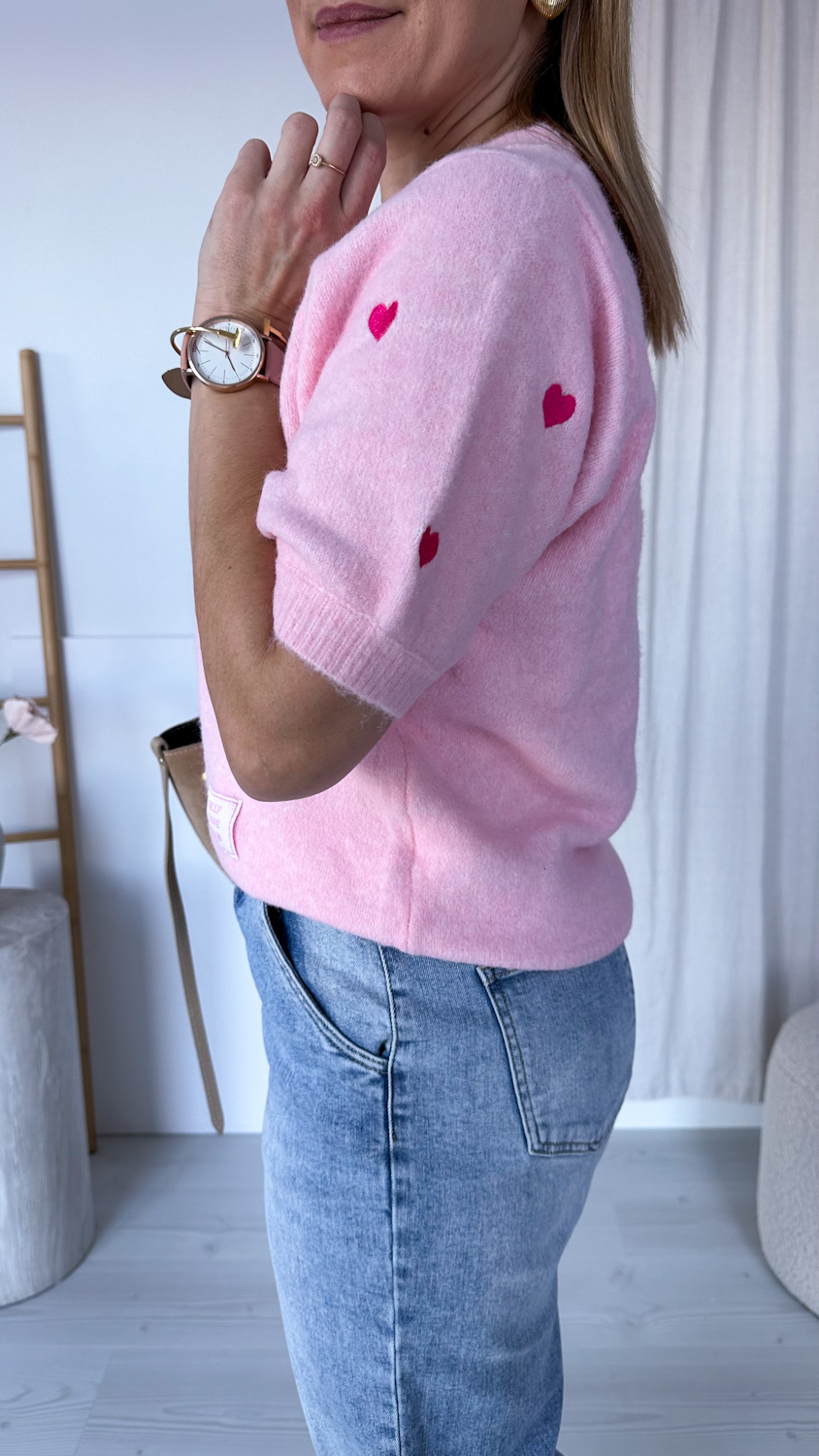 Uroczy sweterek z krótkim rękawem to idealne połączenie komfortu i subtelnej elegancji. Delikatny materiał miękko otula skórę, a haftowane serduszka dodają całości romantycznego charakteru. Krótki rękaw sprawia, że model świetnie sprawdzi się zarówno w cieplejsze dni, jak i jako element stylizacji warstwowej.