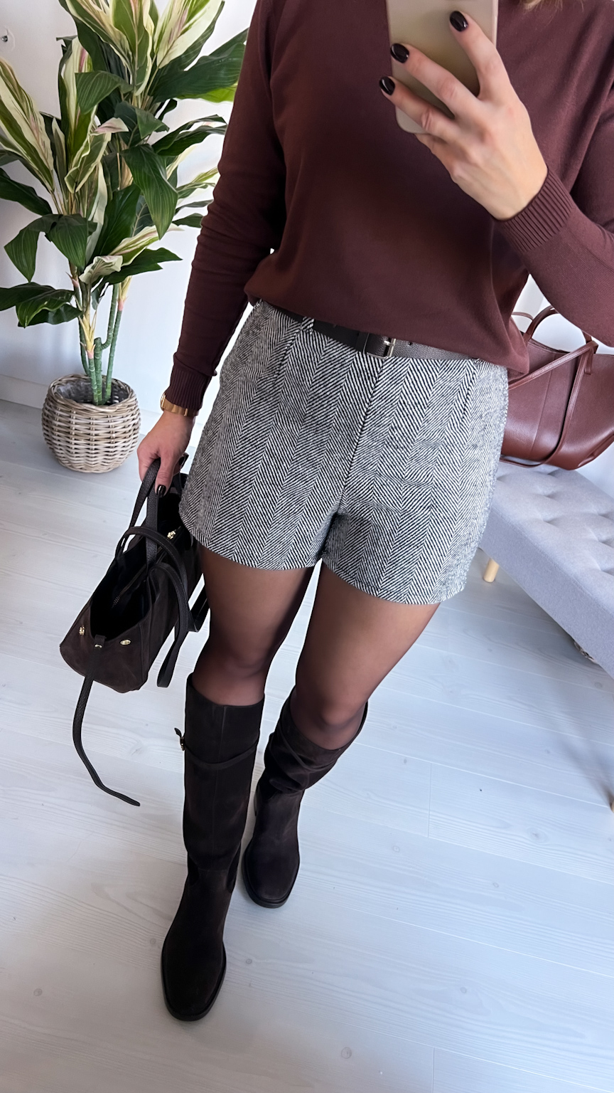 Krótkie spodenki uszyte z tej samej tkaniny w biało-czarną jodełkę, która z daleka daje efekt szlachetnej szarości. Delikatnie podwyższony stan i zapięcie na zamek z boku zapewniają idealne dopasowanie i podkreślają linię talii, a dołączony pasek z tej samej tkaniny pozwala swobodnie regulować obwód i dodaje całości eleganckiego wykończenia.