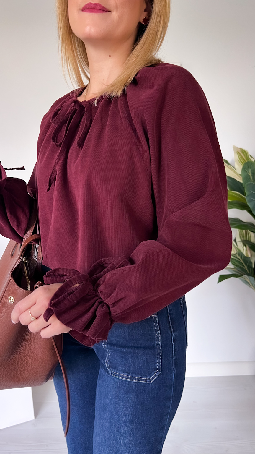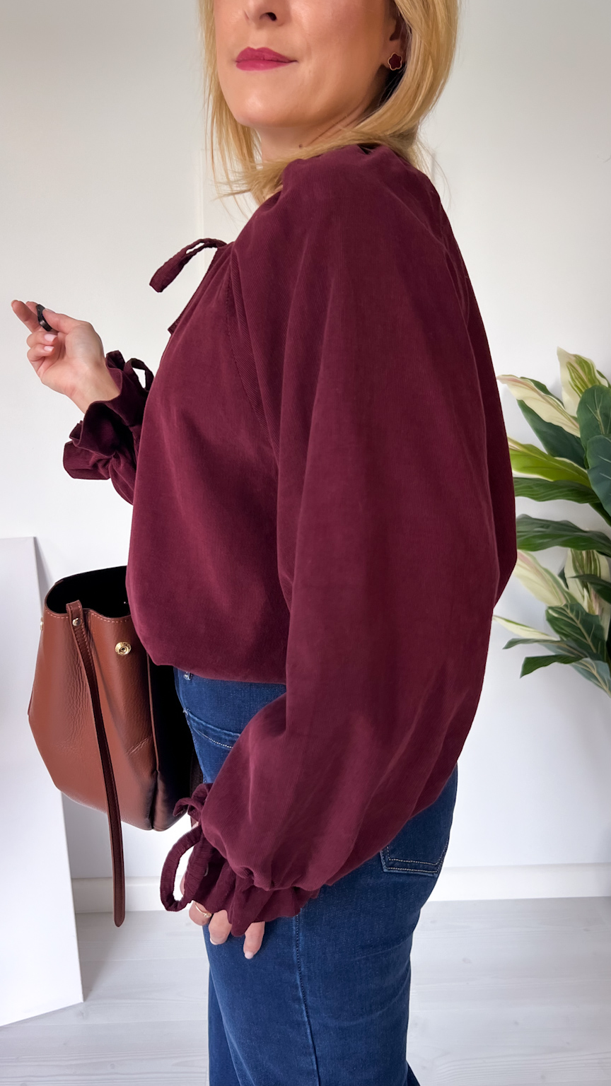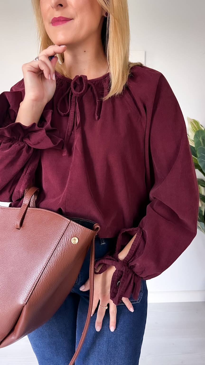 Luźna sztruksowa koszula z wiązaniem i falbankami – idealna na jesień 🍁