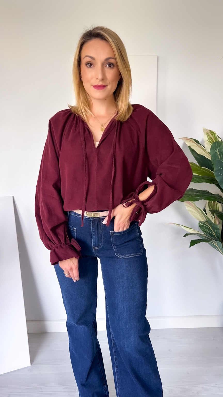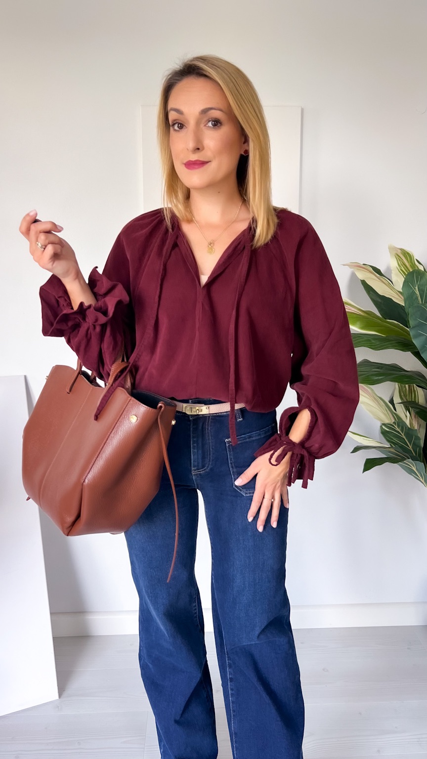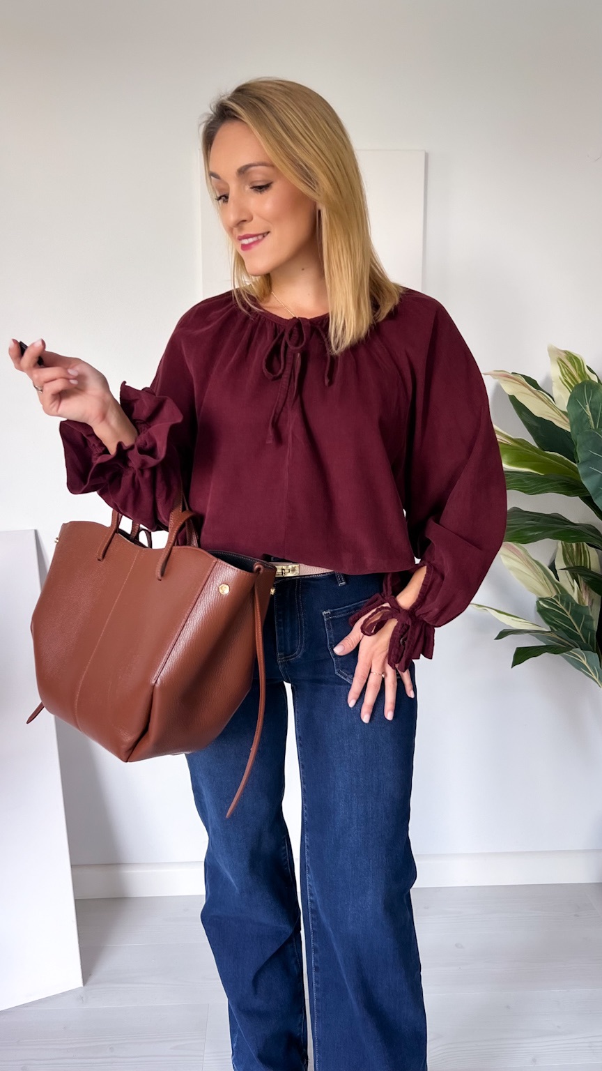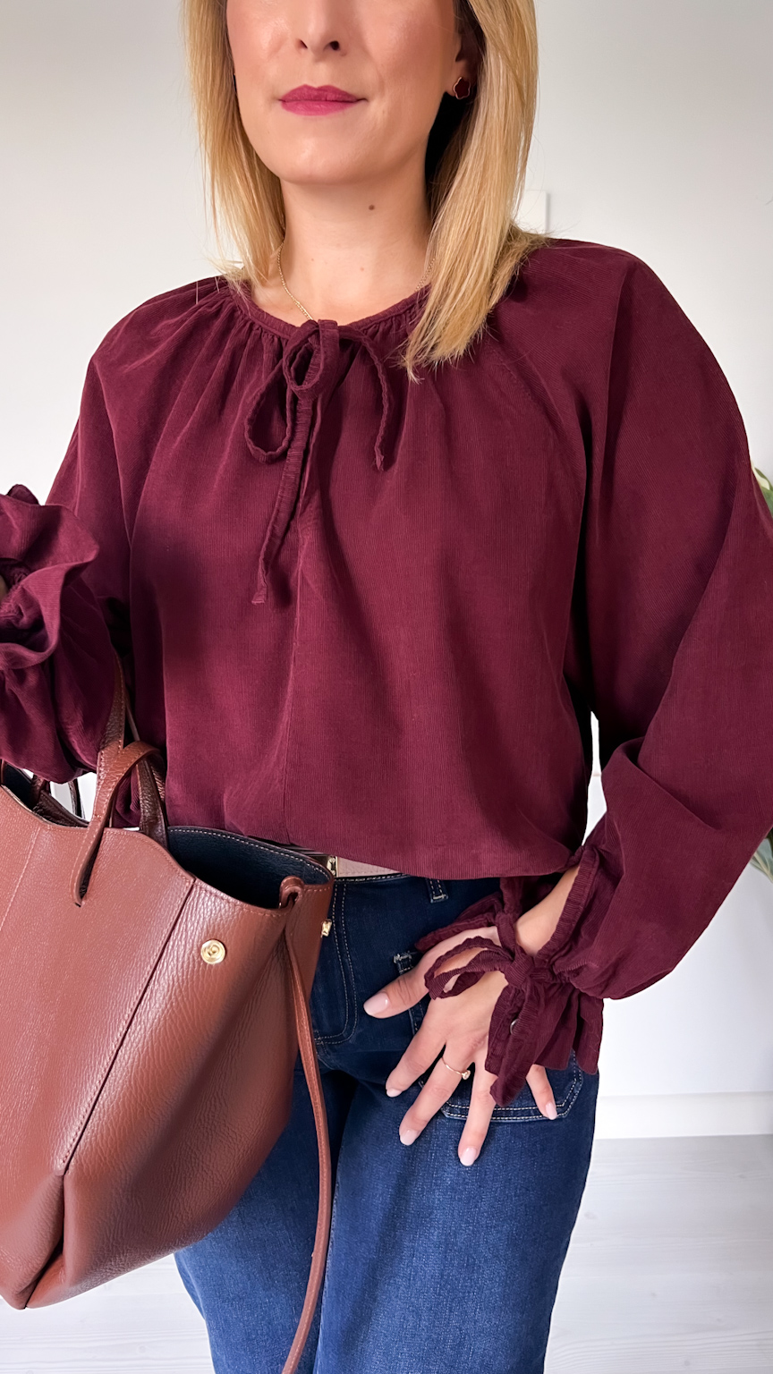 Luźna sztruksowa koszula z wiązaniem i falbankami – idealna na jesień 🍁