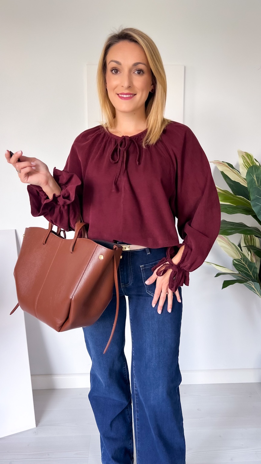 ✨ Rękawy zakończone falbanką i wiązaniem – lekki, kobiecy akcent, który nadaje koszuli wyjątkowego charakteru.