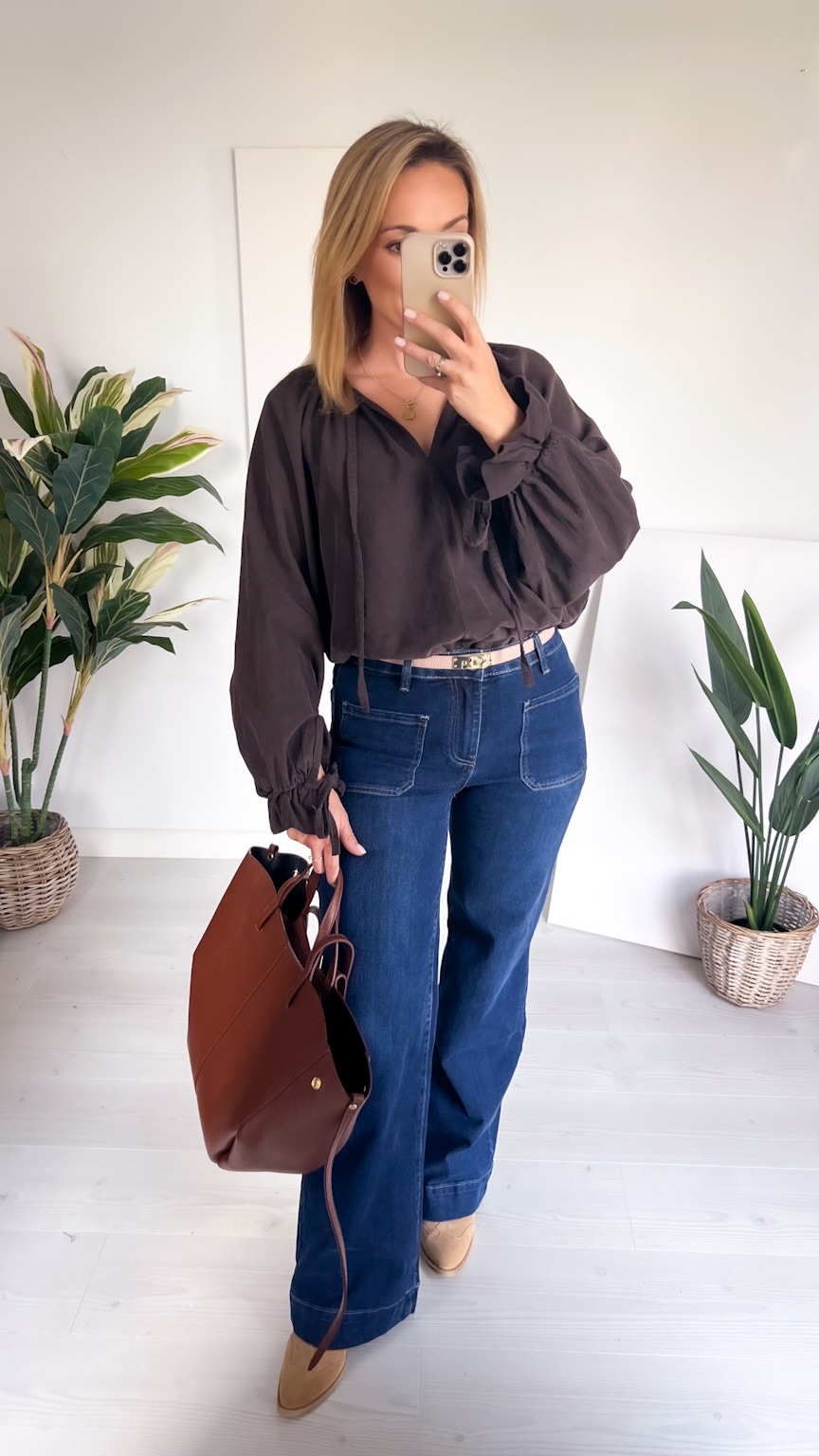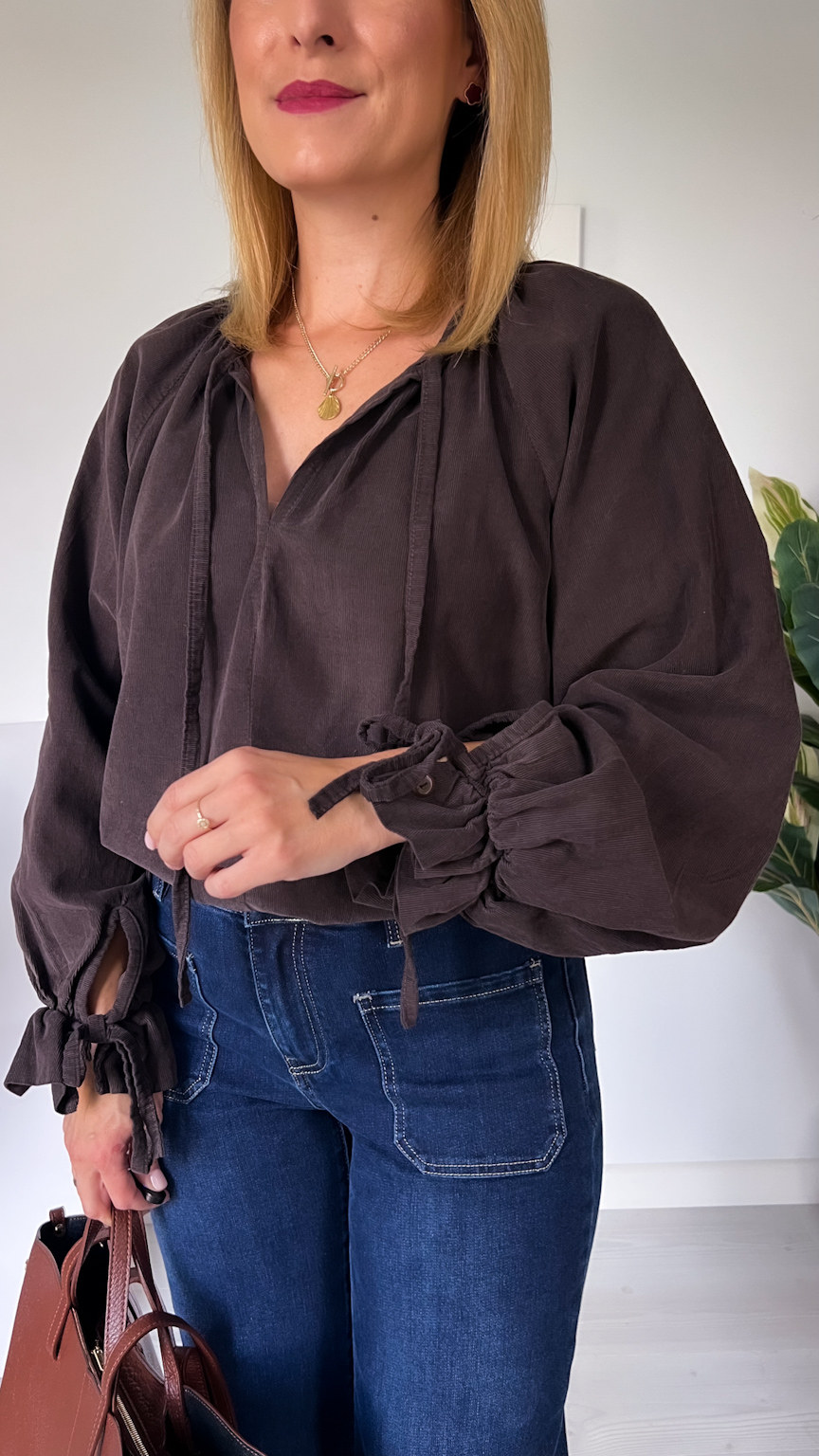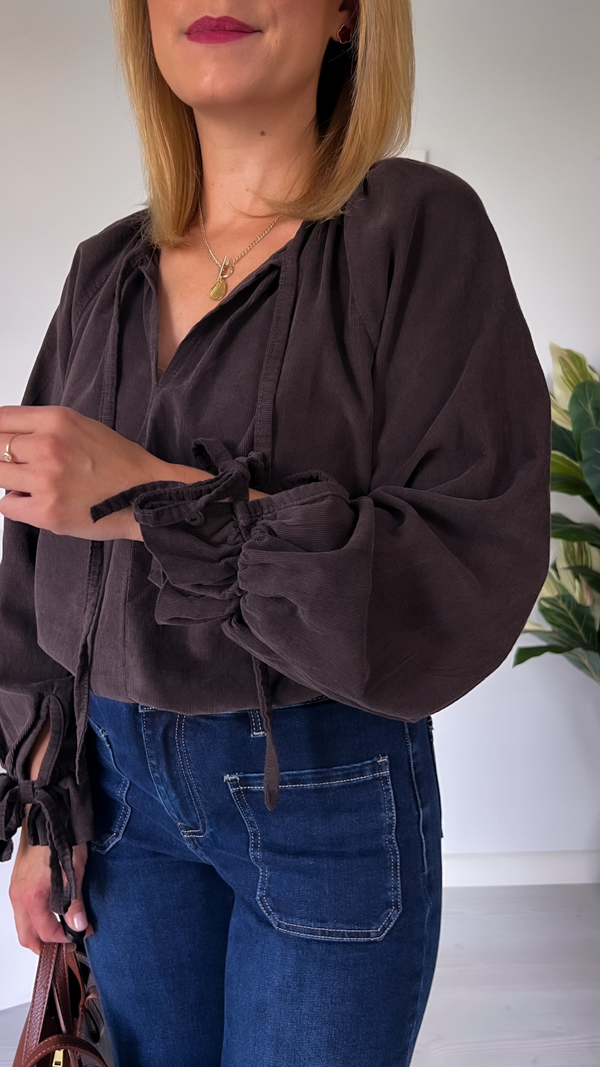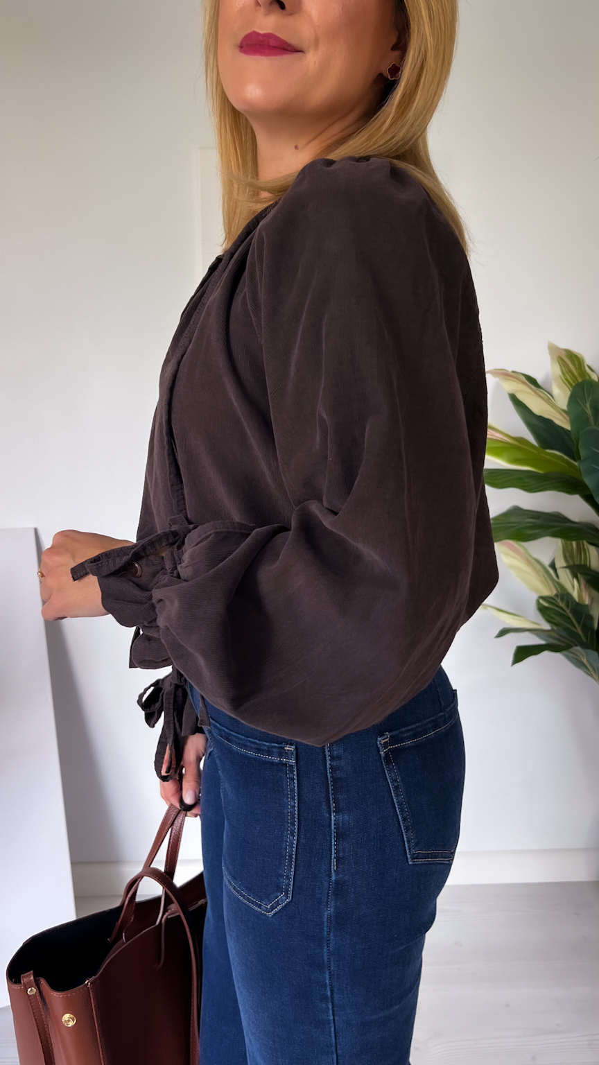Luźna sztruksowa koszula z wiązaniem i falbankami – idealna na jesień 🍁