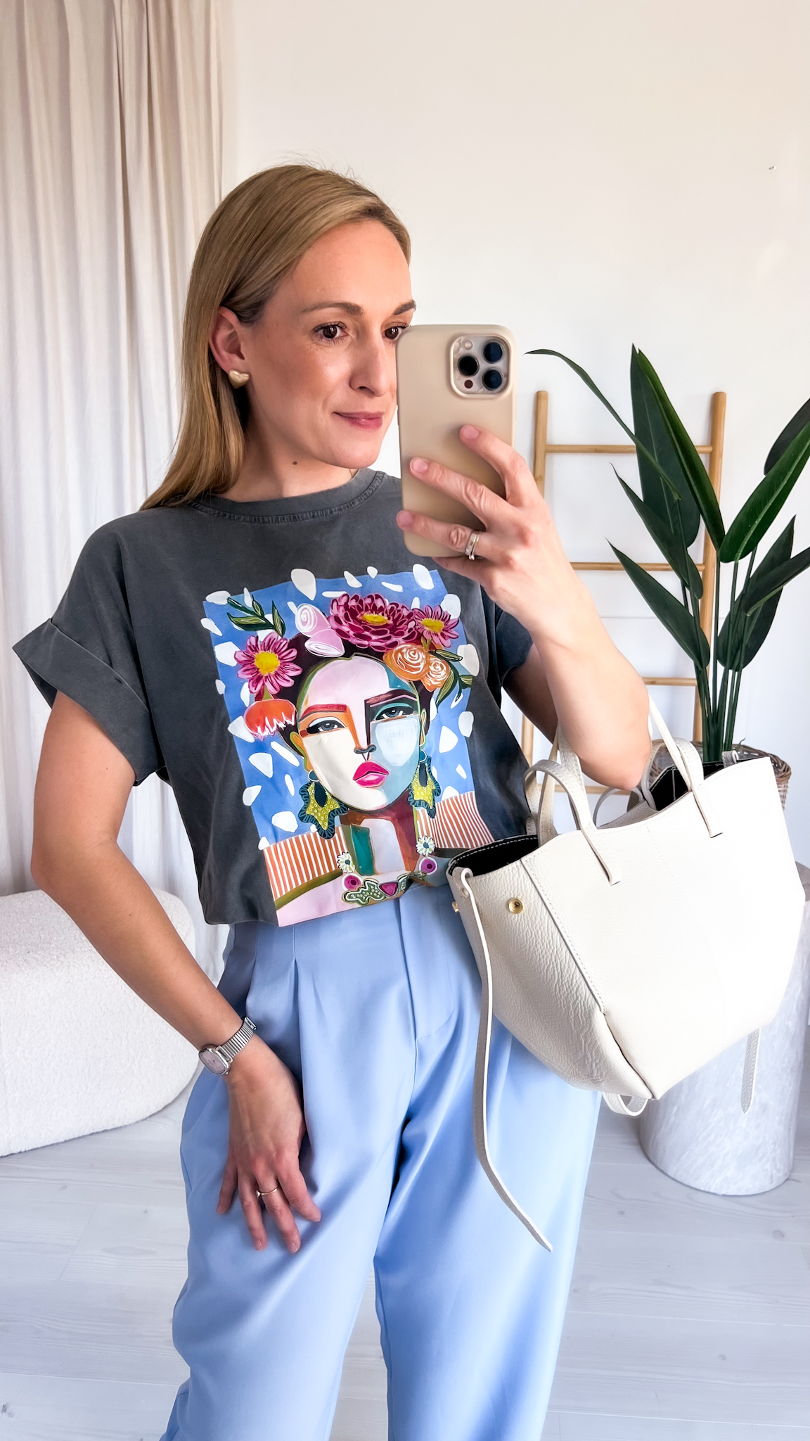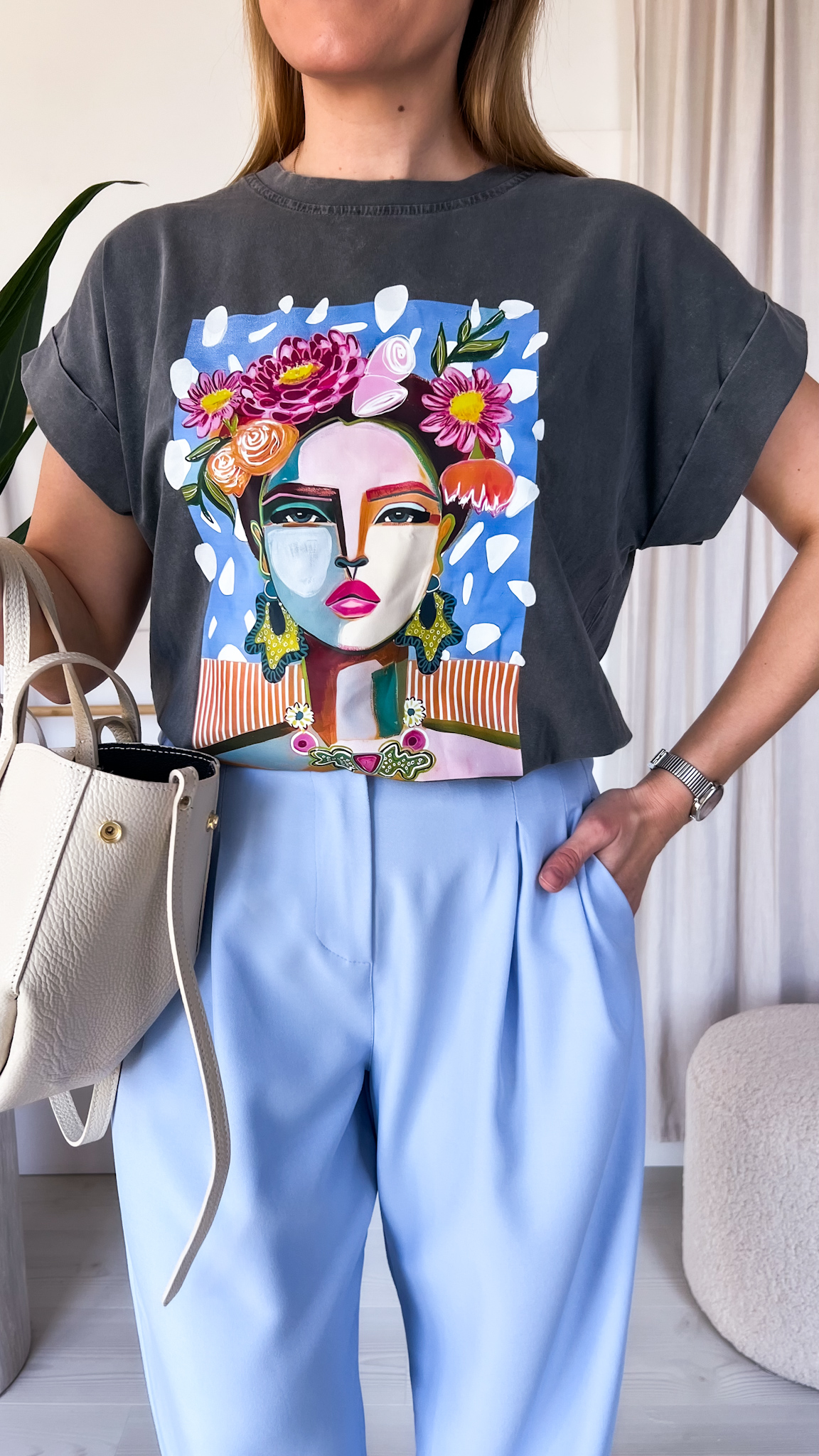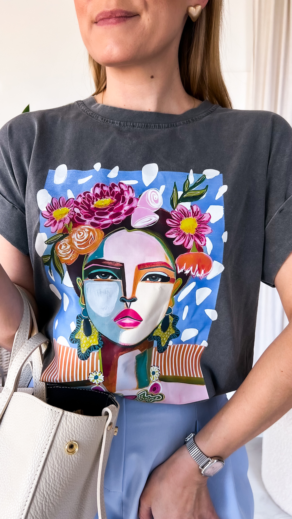 Jeśli szukasz wygodnej, stylowej bluzki z nutą sztuki i indywidualizmu, ten szary t-shirt z motywem FRIDY będzie idealnym uzupełnieniem Twojej garderoby.
