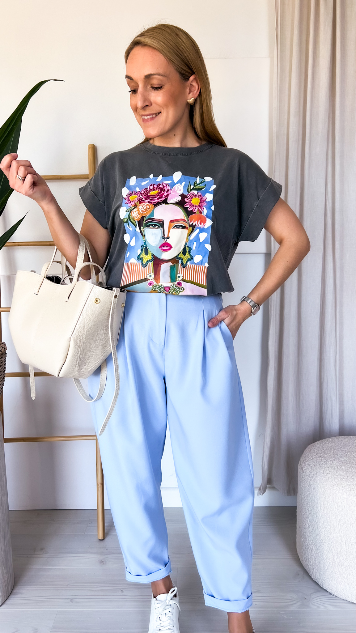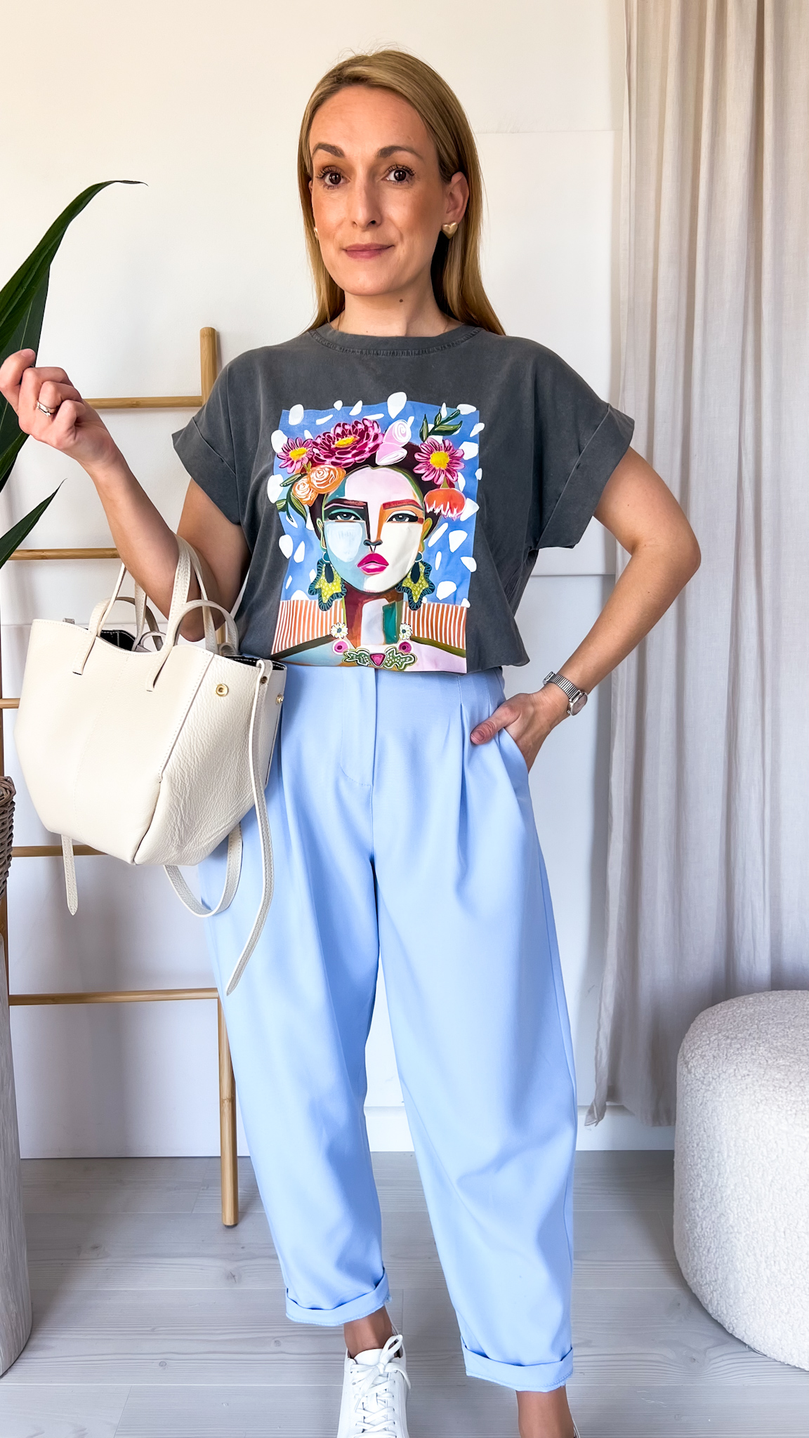 Szary t-shirt z podwiniętymi rękawami z nadrukiem inspirowanym Fridą to stylowa propozycja dla kobiet, które kochają modę z charakterem. Klasyczny odcień szarości sprawia, że bluzka jest uniwersalna i łatwa do stylizowania, a artystyczny motyw nadaje jej wyjątkowego, wyrazistego klimatu.